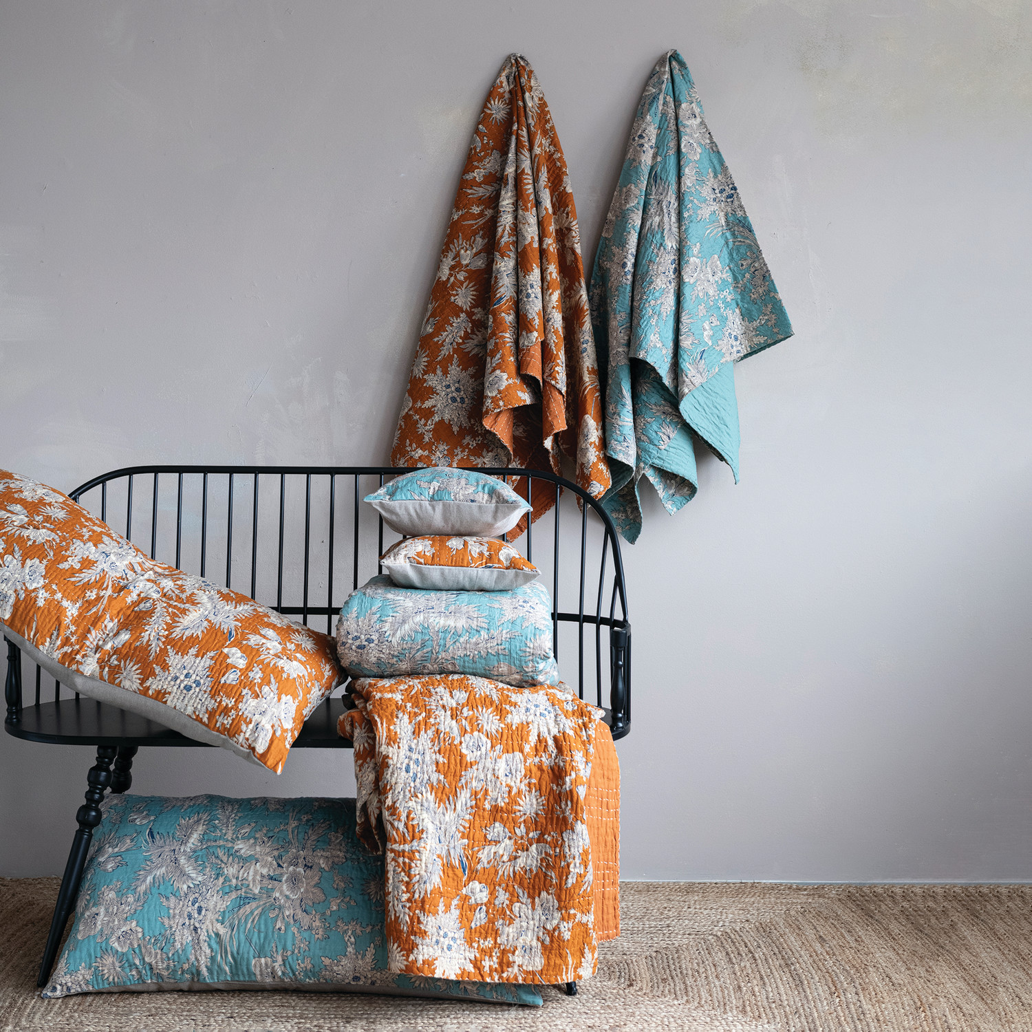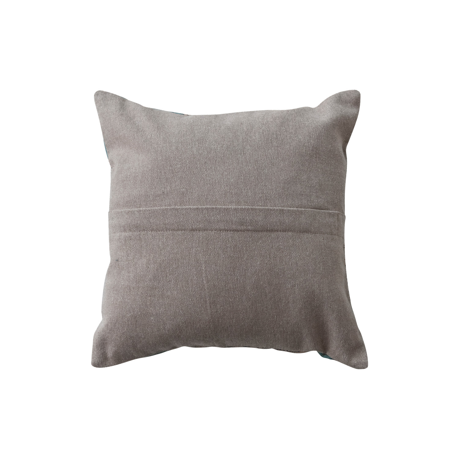 Catalog Name: 12" Square Cotton Voile Printed Pillow w/ Florals, Hand-Embroidered Kantha Stitch & Chambray Back, Blue & White