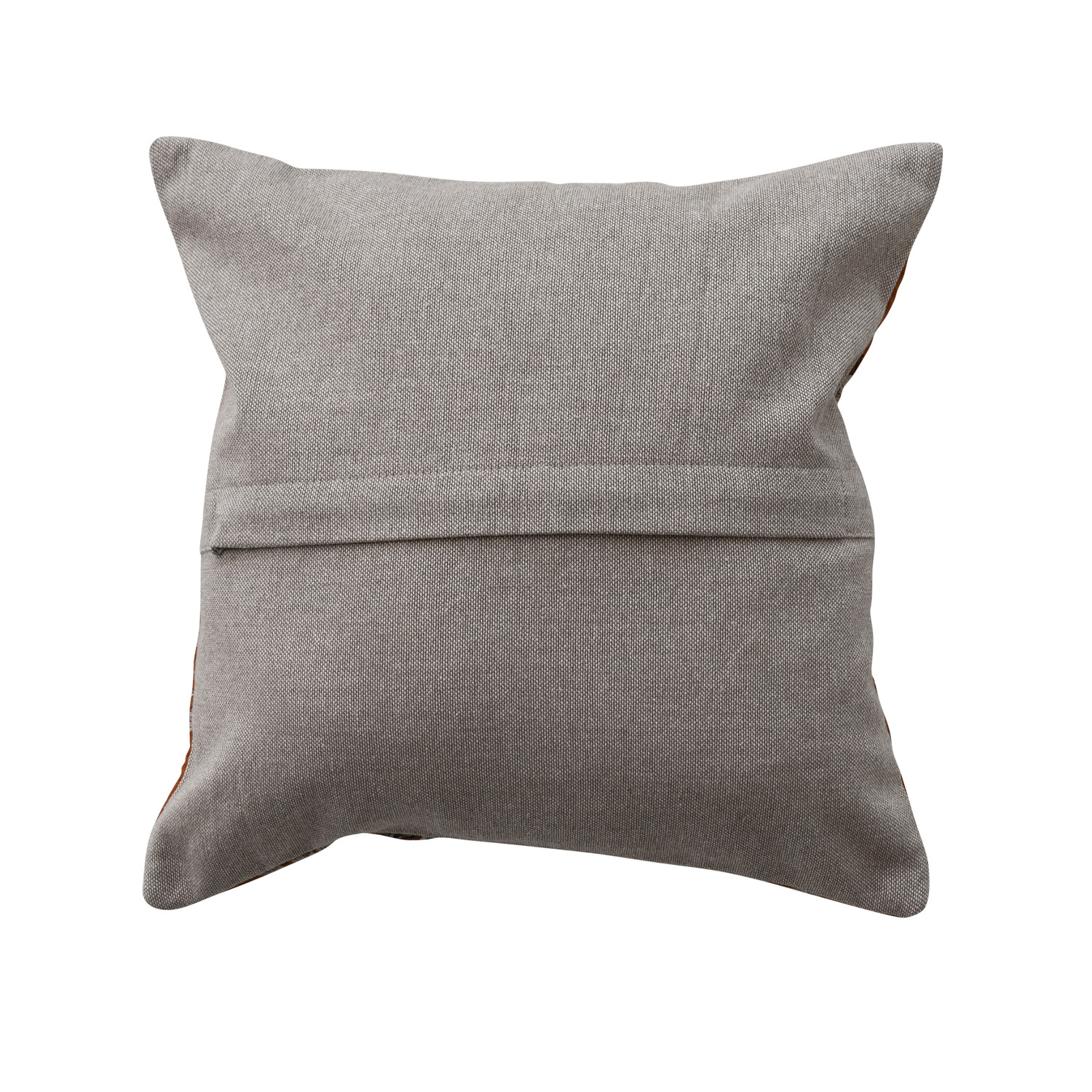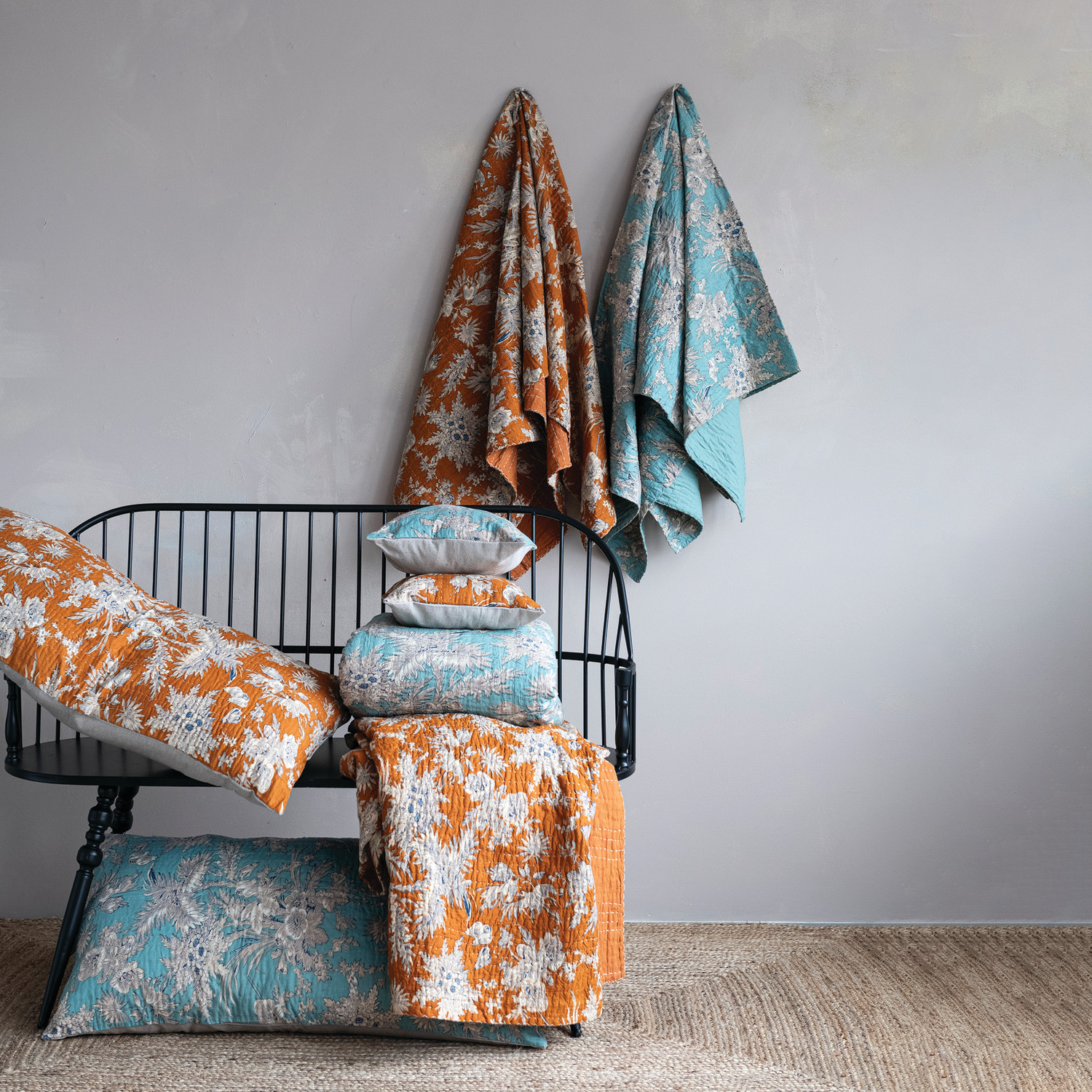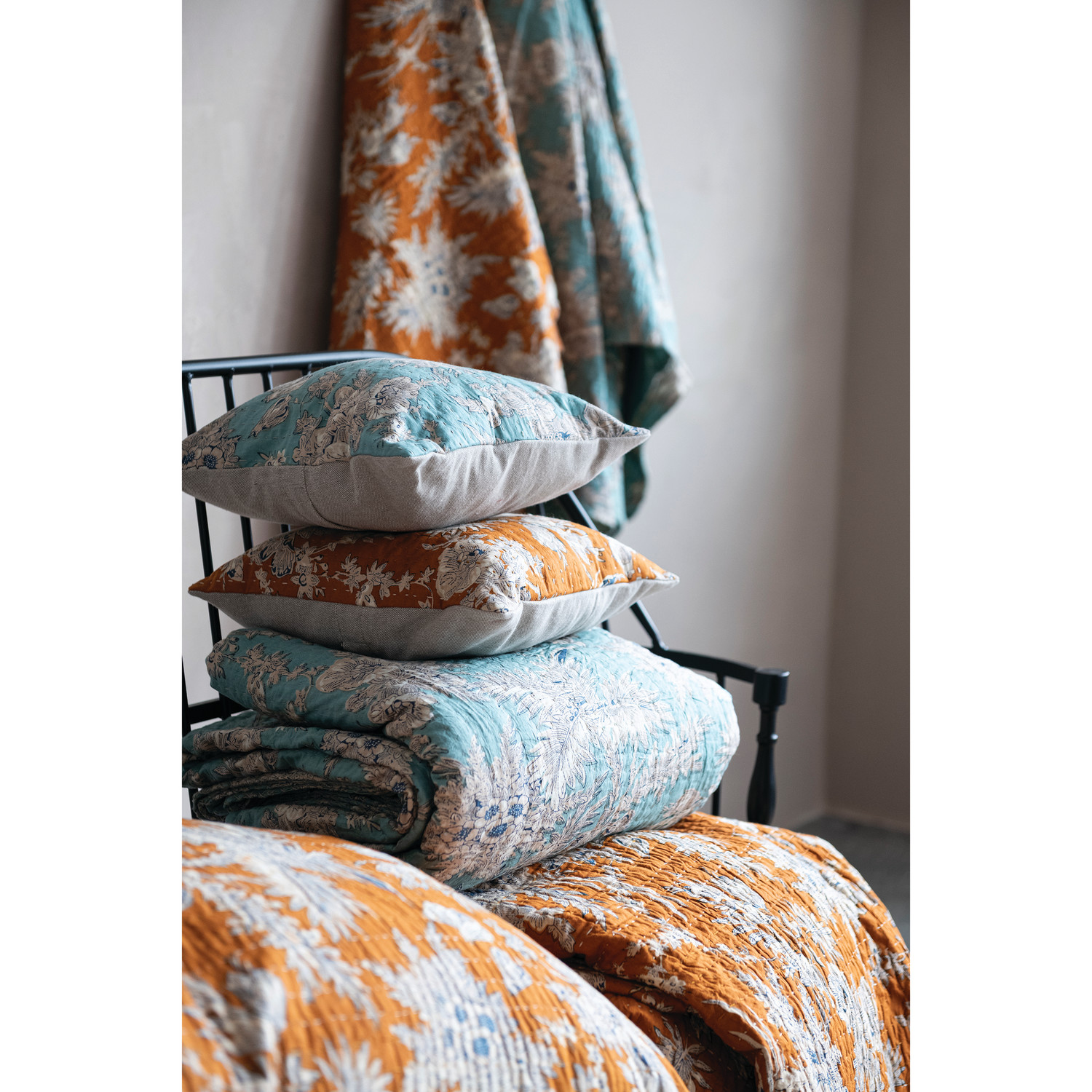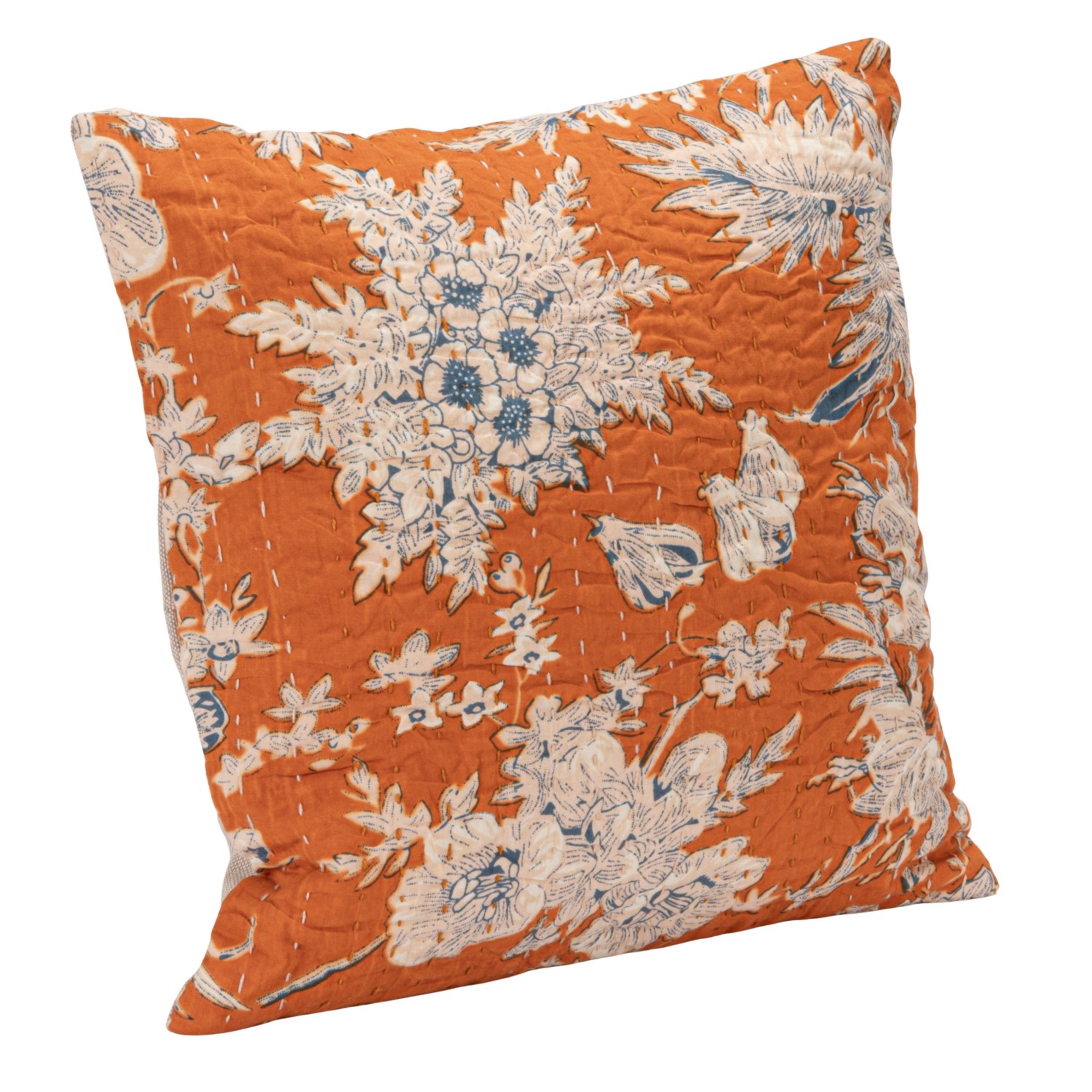 Catalog Name: 12" Square Cotton Voile Printed Pillow w/ Florals, Hand-Embroidered Kantha Stitch & Chambray Back, Gold Color, Blue & White