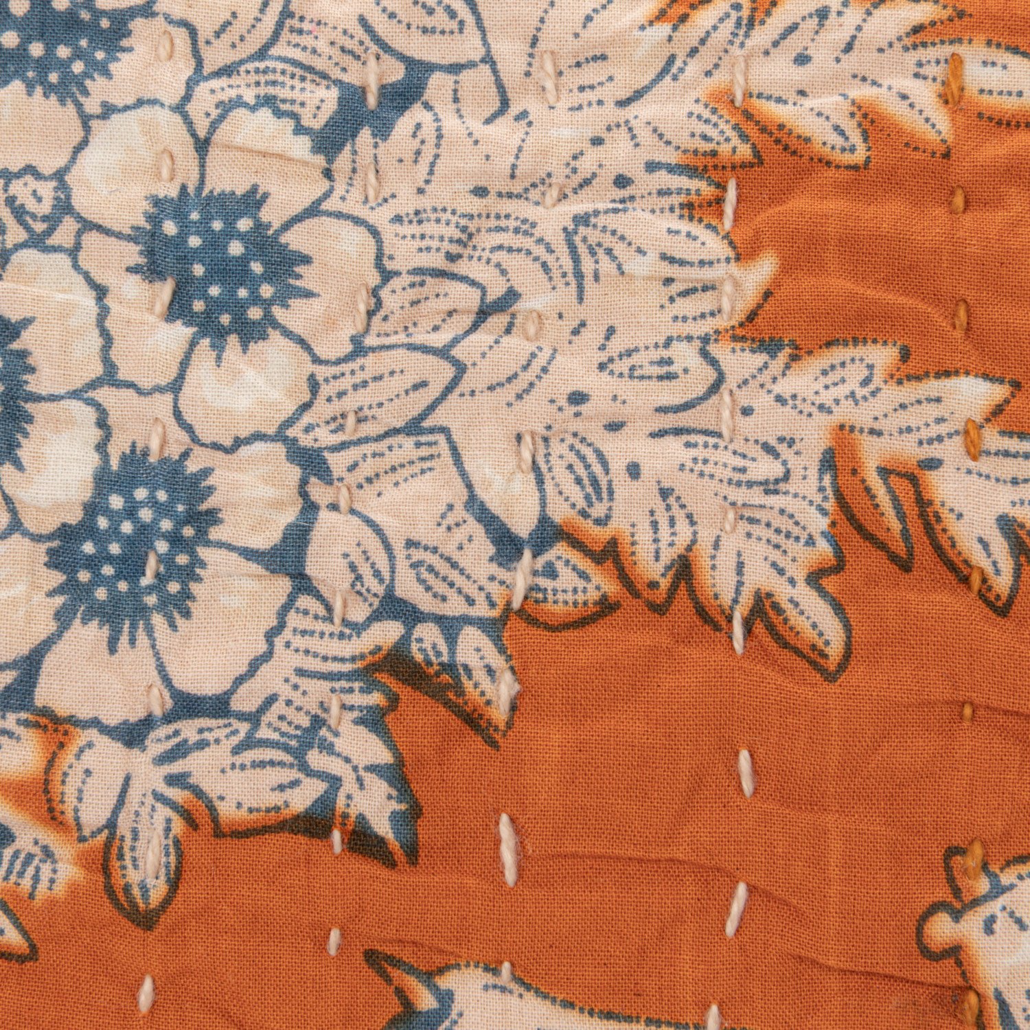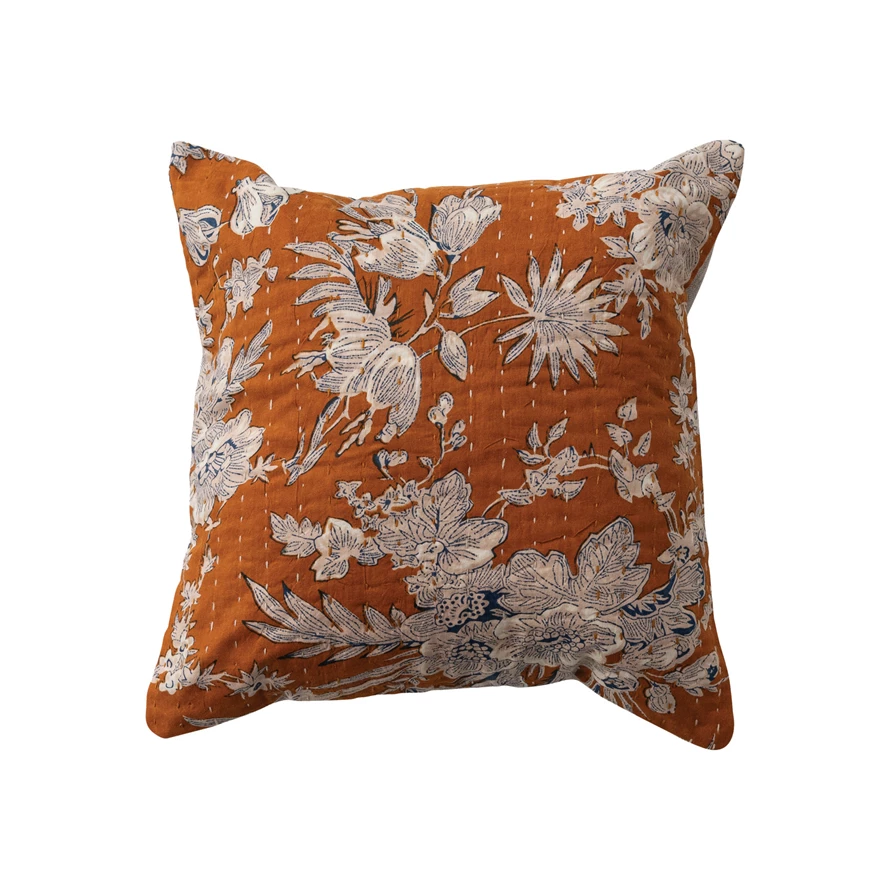 Catalog Name: 12" Square Cotton Voile Printed Pillow w/ Florals, Hand-Embroidered Kantha Stitch & Chambray Back, Gold Color, Blue & White