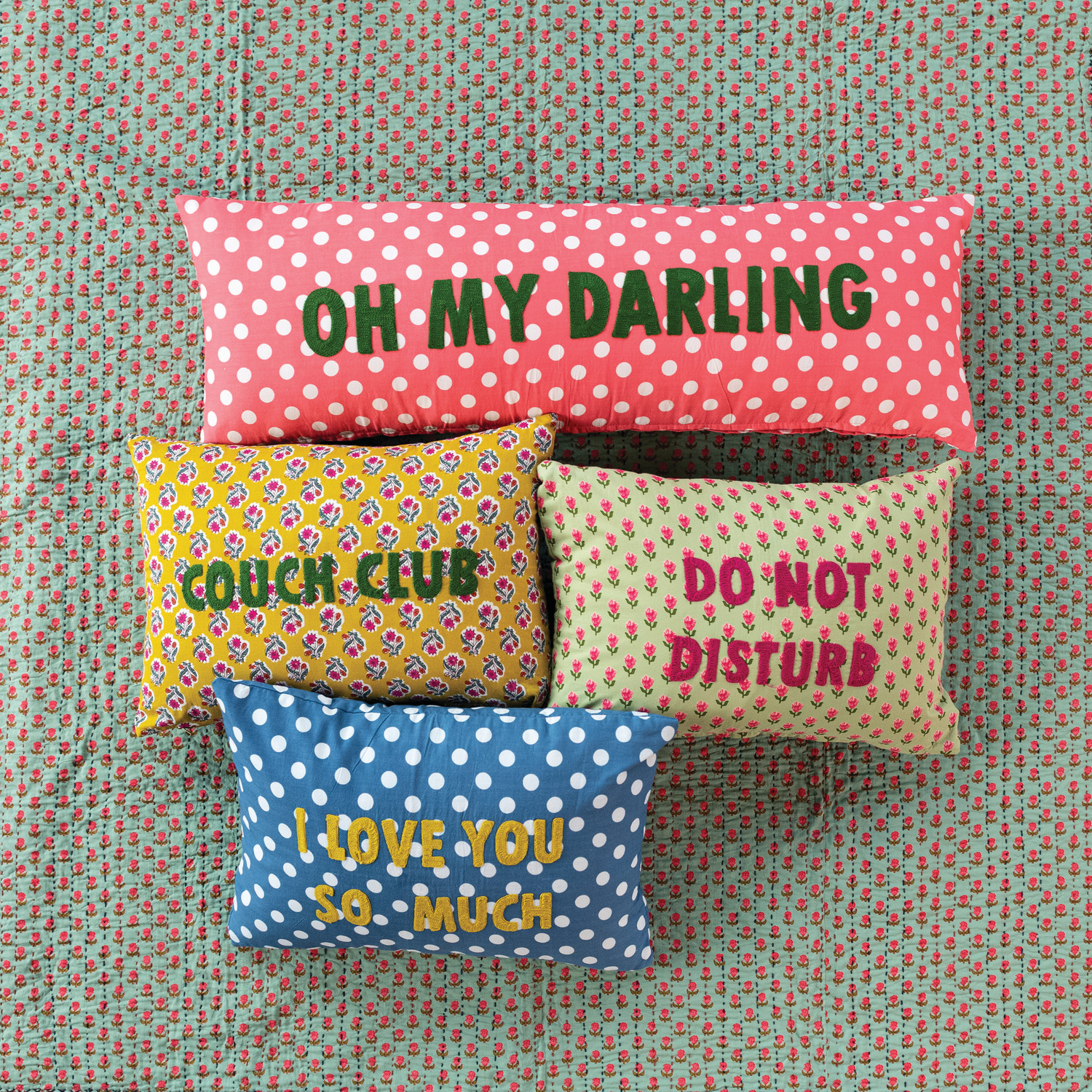 Catalog Name: 36"L x 12"H Cotton Voile Printed Lumbar Pillow w/ Polka Dots & Embroidery "Oh My Darling", Pink, White & Green