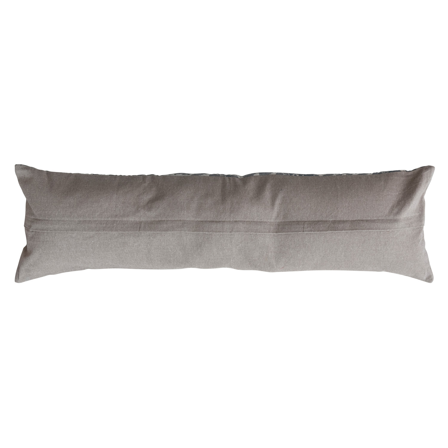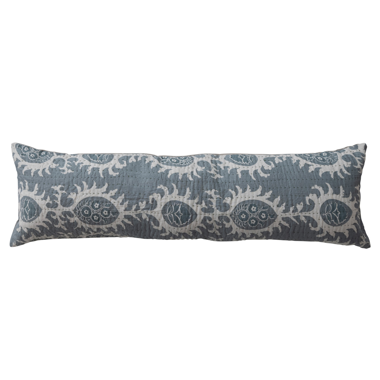 Catalog Name: 36"L x 10"H Cotton Voile Printed Lumbar Pillow w/ Pattern, Hand-Embroidered Kantha Stitch & Chambray Back, Blue & White