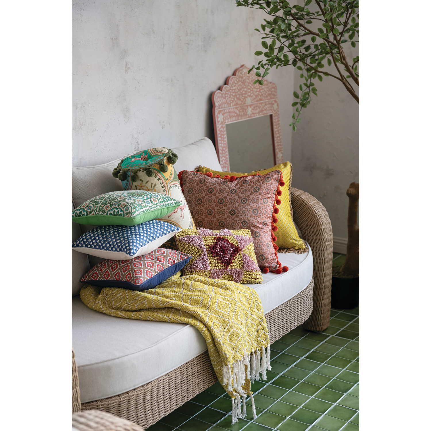 12" Square Cotton Slub Pillow with Block Print Pattern & Piping, 3 Styles