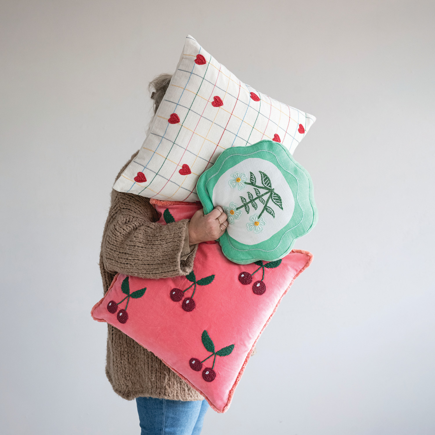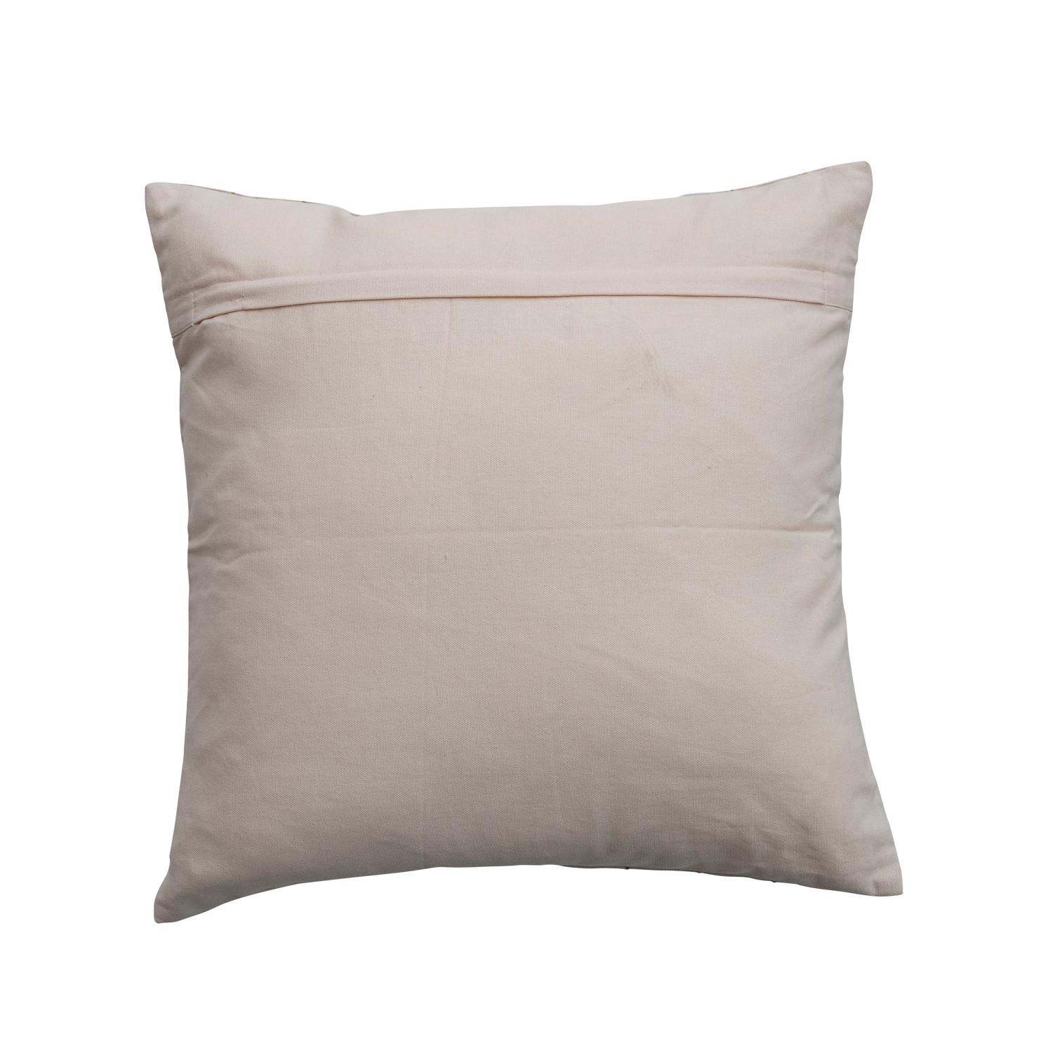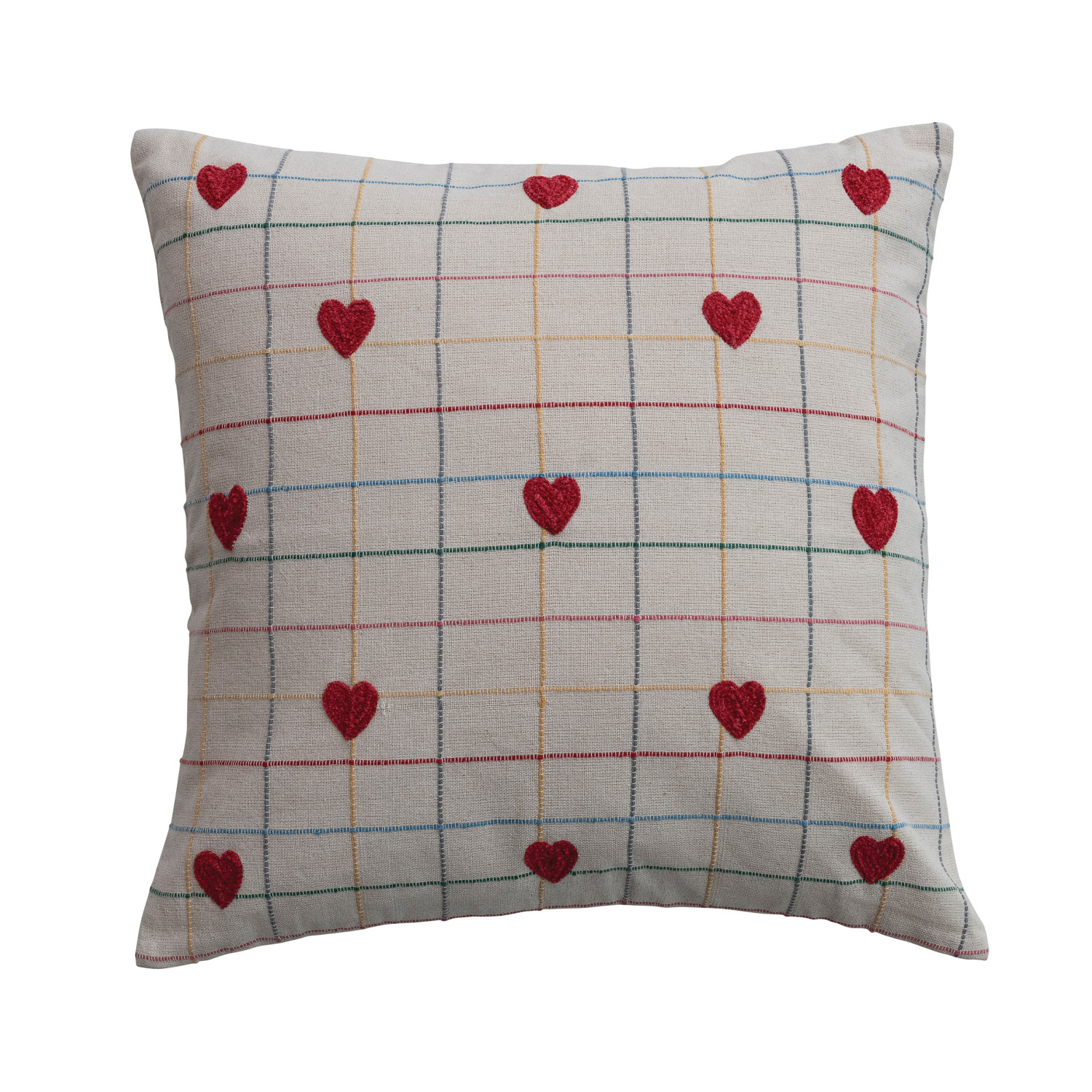 Catalog Name: 20" Square Woven Cotton Pillow w/ Grid Pattern & Embroidered Hearts, Multi Color