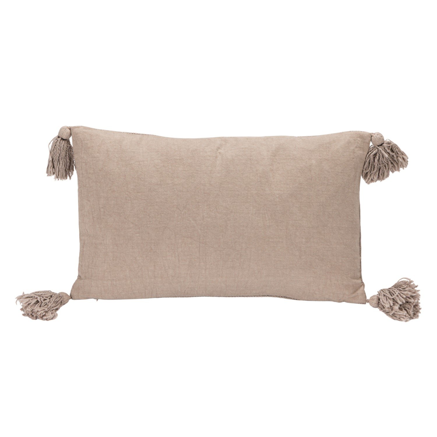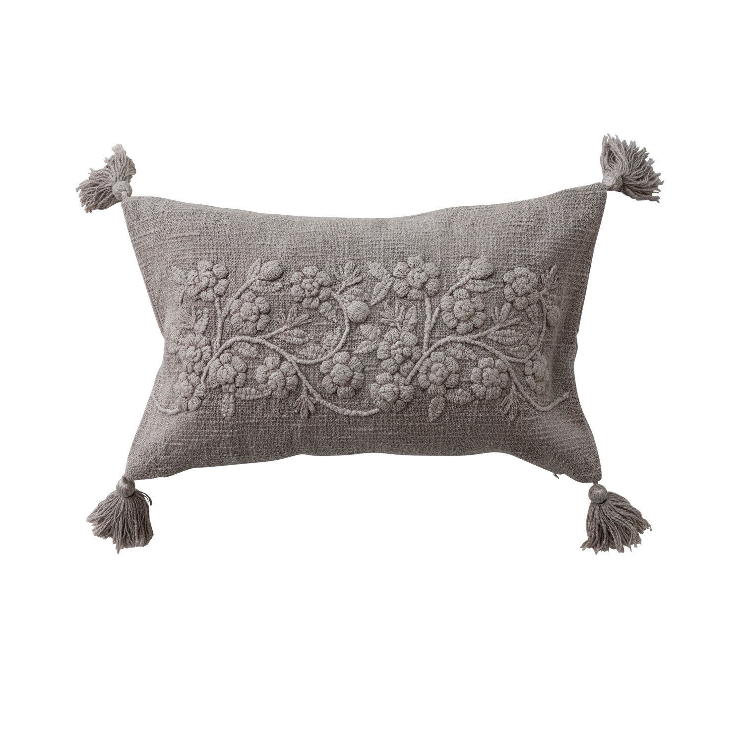 Catalog Name: 20"L x 12"H Stonewashed Cotton Slub Lumbar Pillow w/ Embroidered Flowers & Tassels, Taupe
