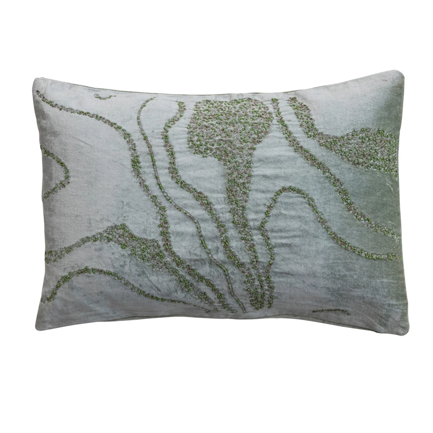 Catalog Name: 20"L x 14"H Cotton Velvet Lumbar Pillow w/ Beaded Design, Mint Color & Green