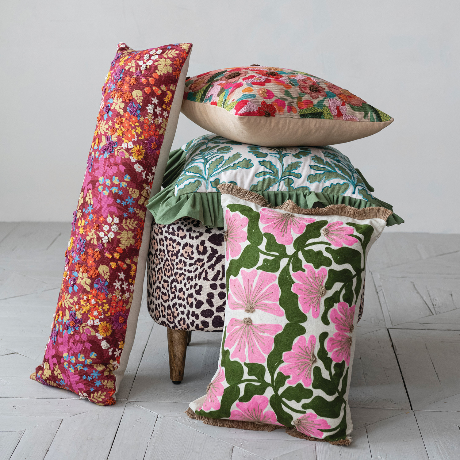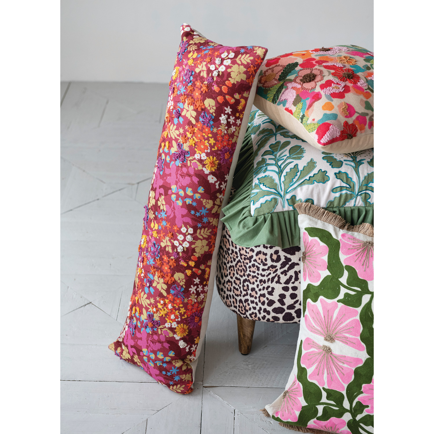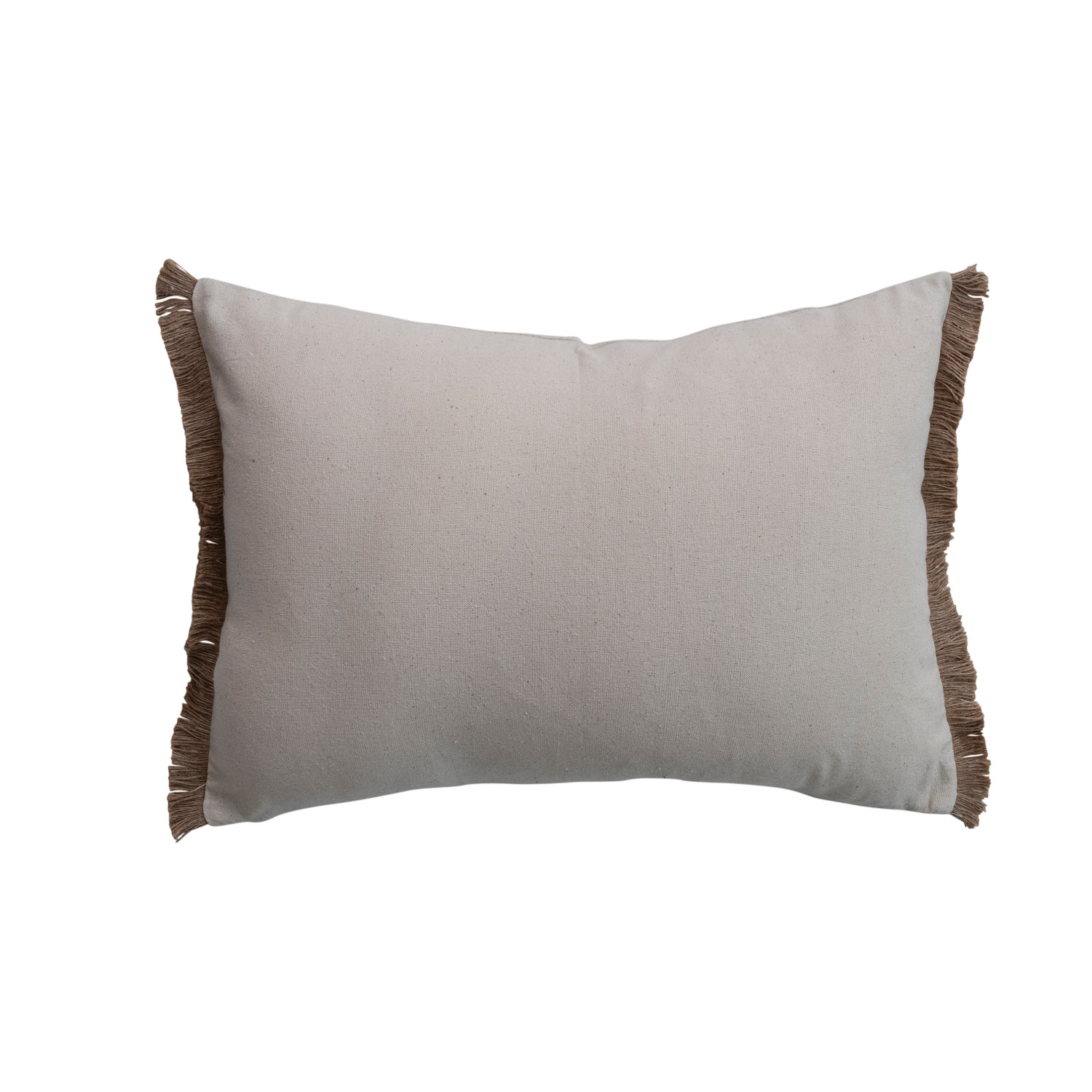 Cotton & Linen Lumbar Pillow with Embroidered Flowers & Jute Eyelash Fringe