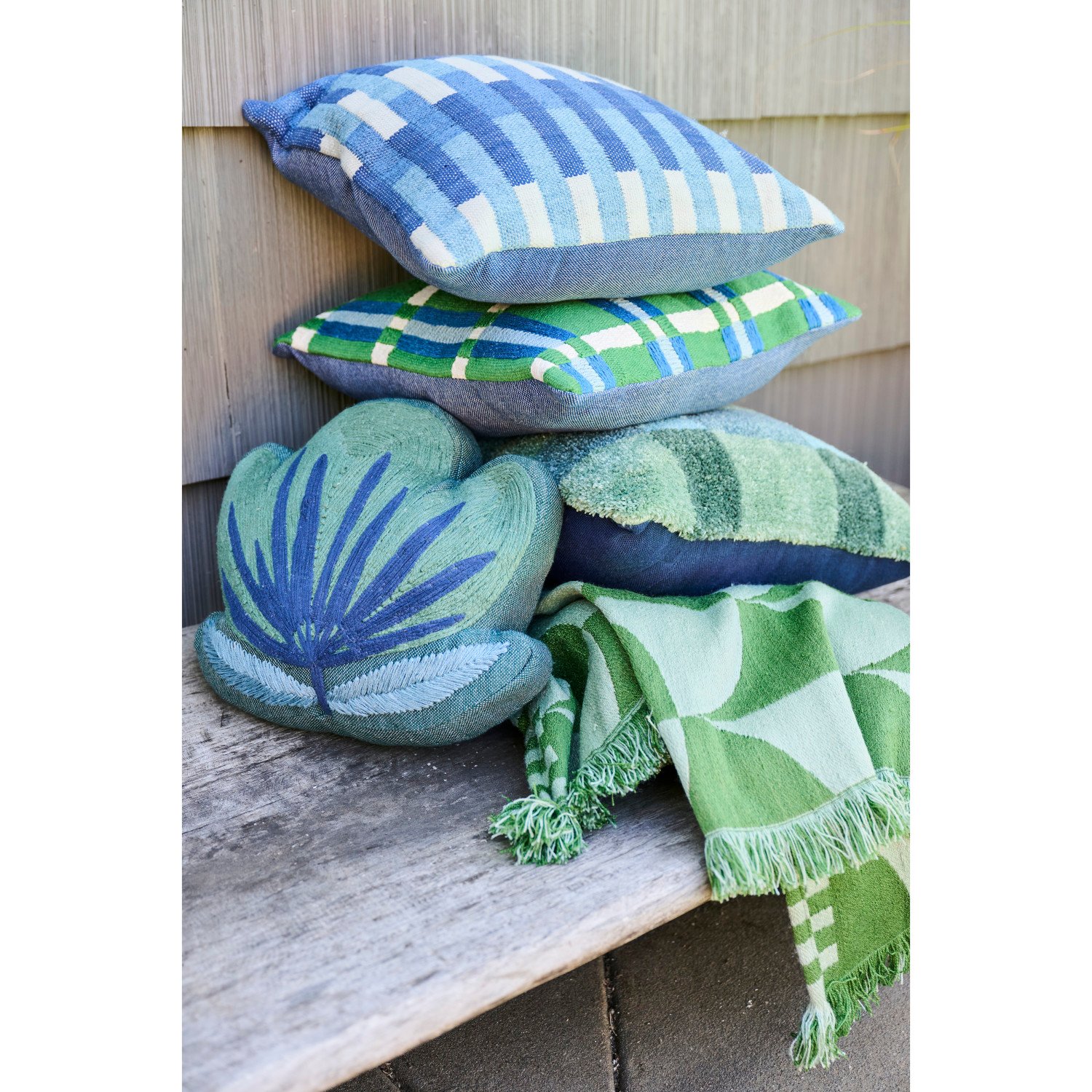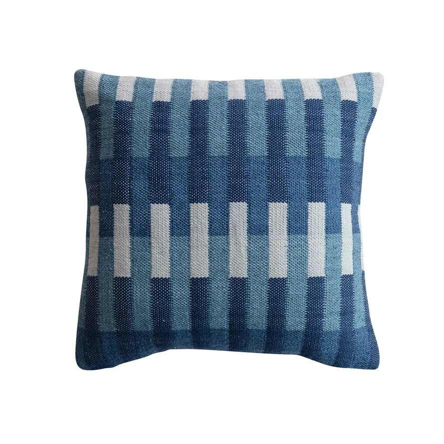Catalog Name: 18" Square Woven Fabric Indoor/Outdoor Pillow w/ Embroidery & Stripe Pattern, Blue & Cream Color