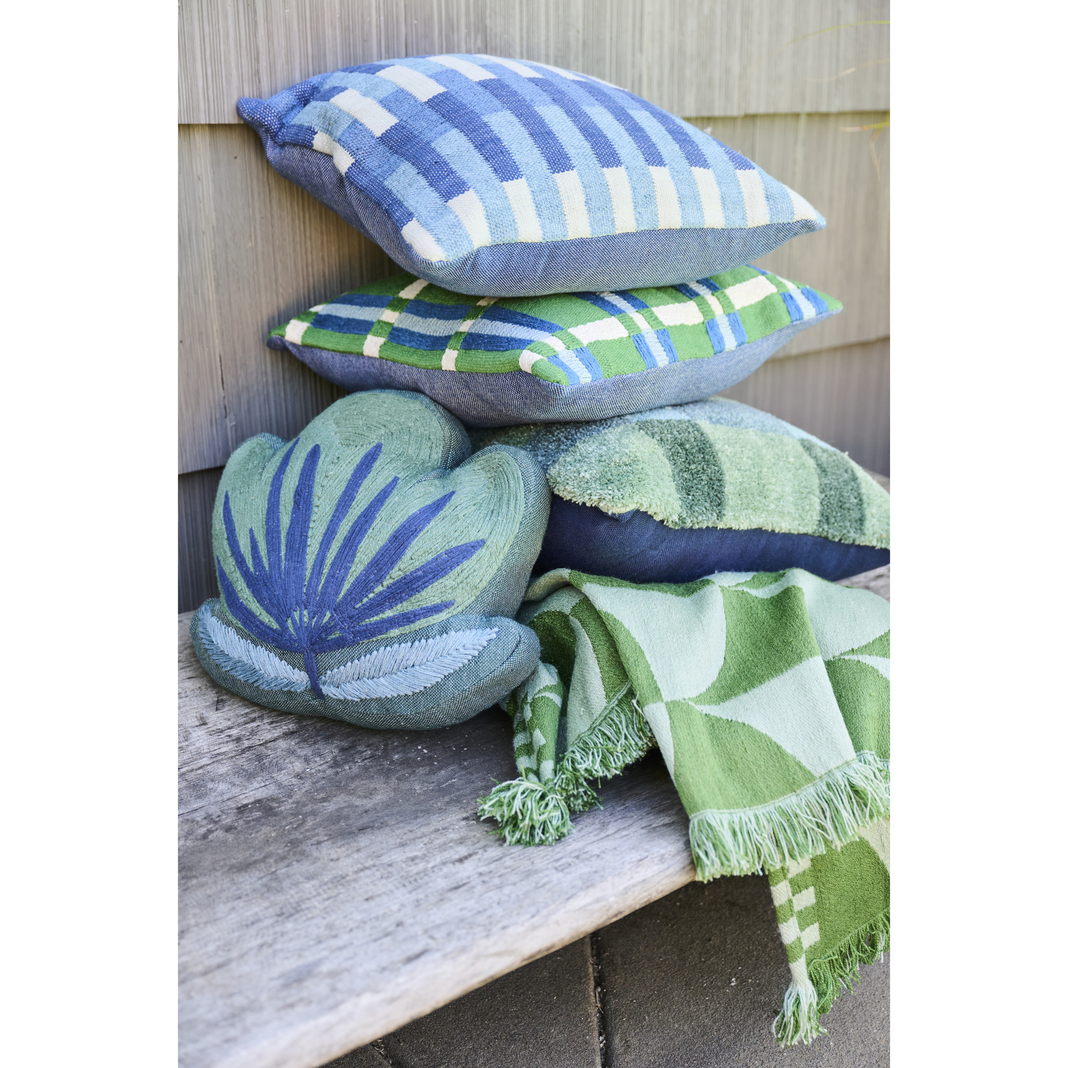 Woven Fabric Indoor/Outdoor Flower Shaped Pillow with Embroidery, Green & Blue