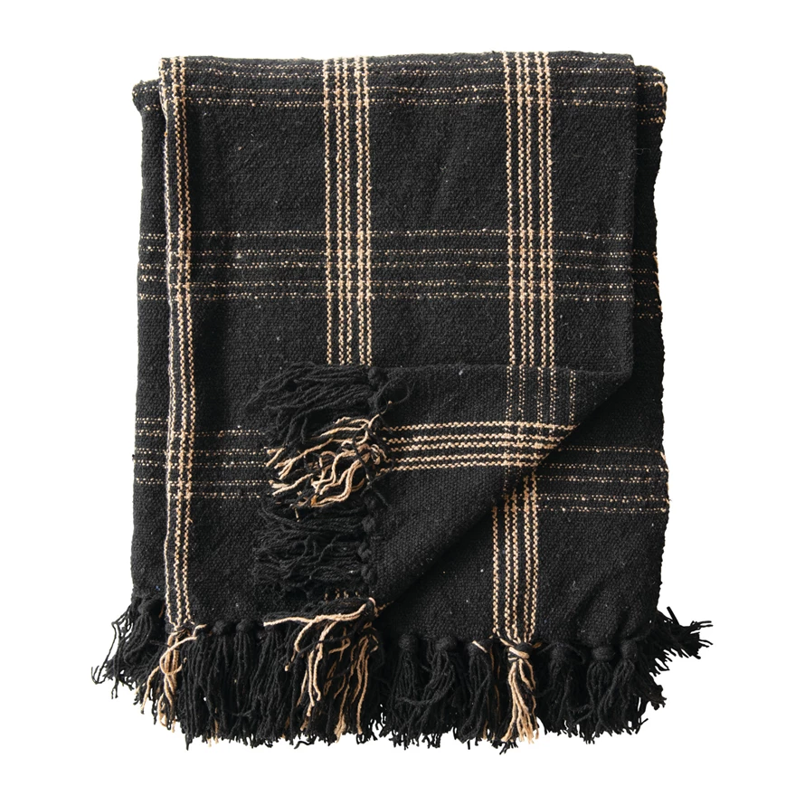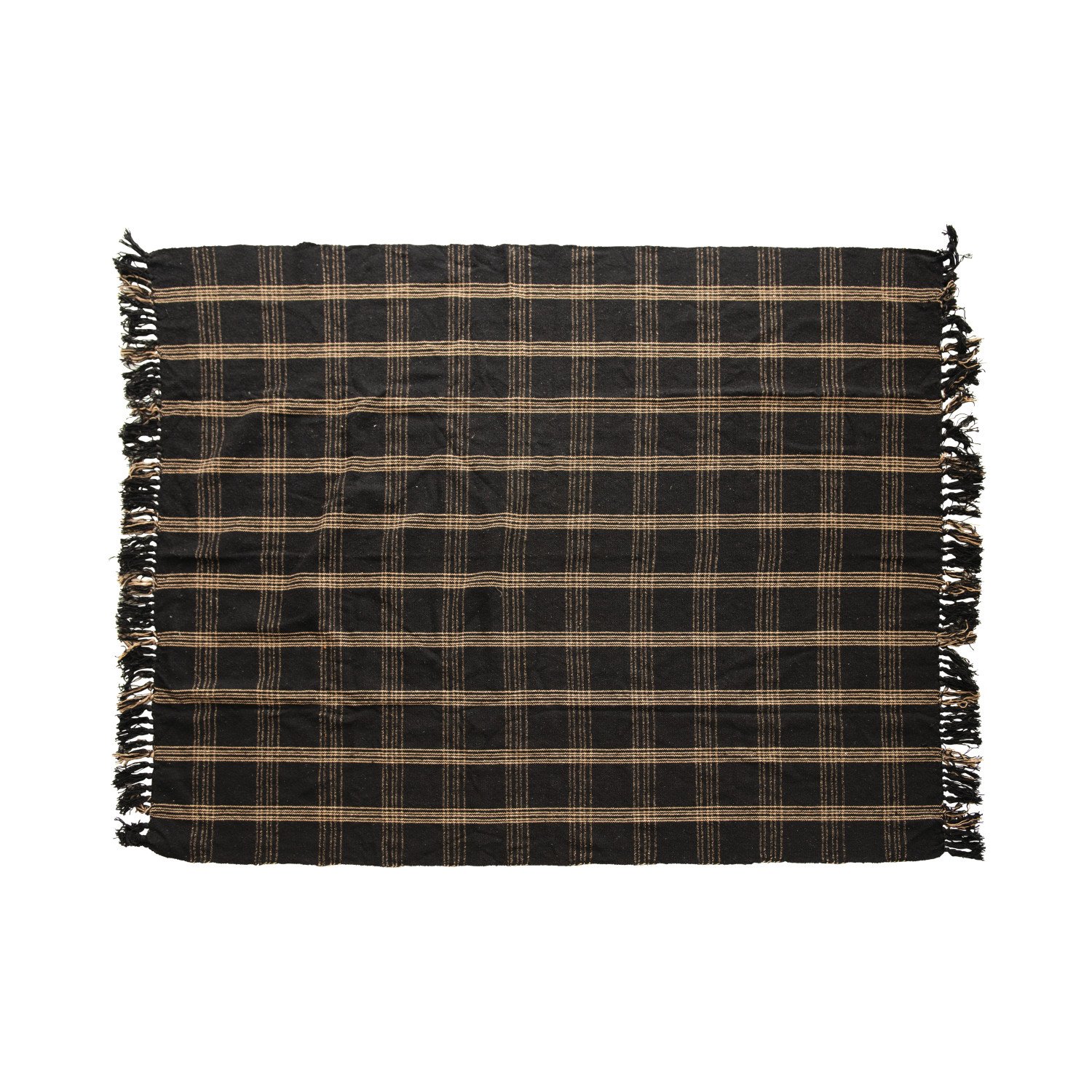 Catalog Name: 60"L x 50"W Woven Recycled Cotton Blend Throw w/ Fringe, Black & Tan Color Plaid
