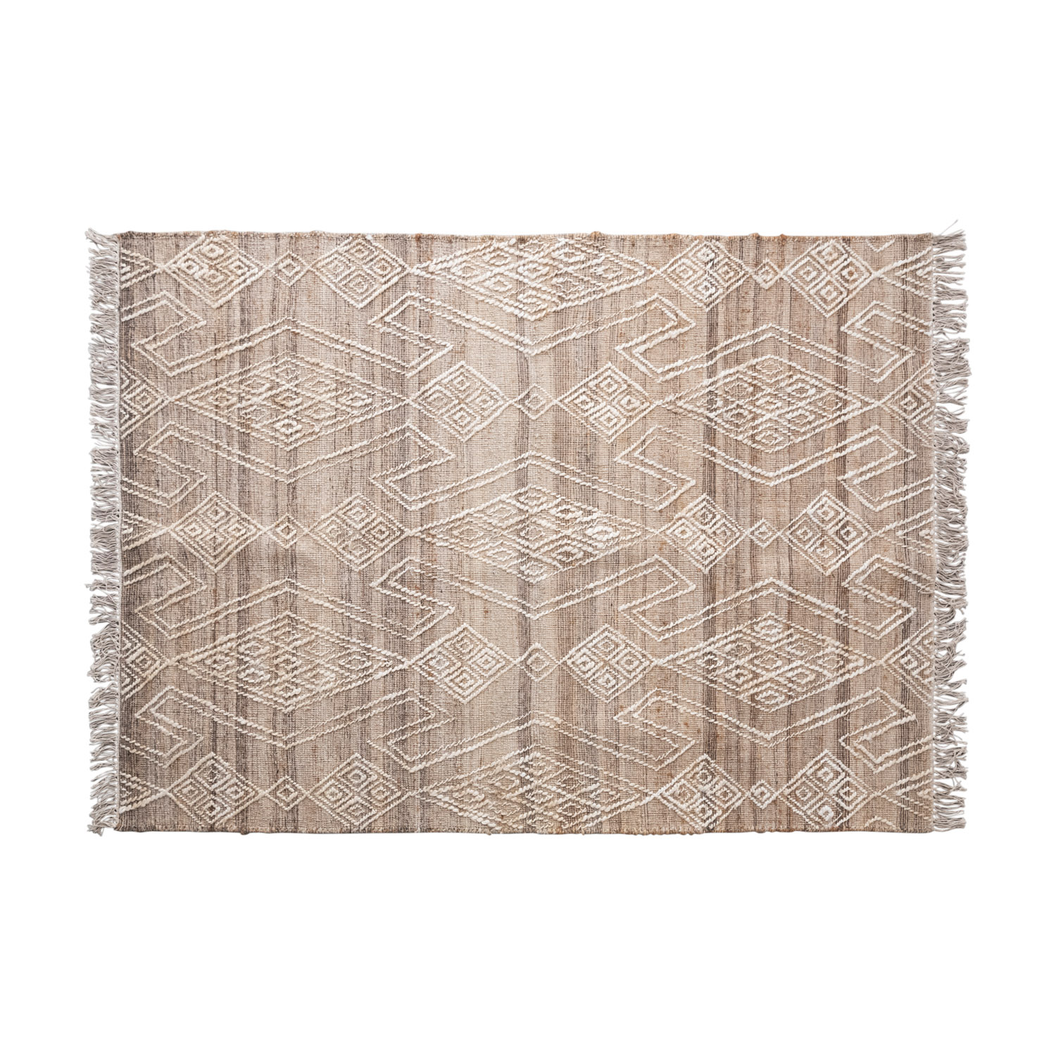 This boho area rug showcases intricately hand-woven jute and cotton construction with a geometric pattern, finished with decorative fringe. Beige and cream woven jute and cotton area rug with geometric pattern and fringe. Spot clean only. Made from wool, cotton, and jute.