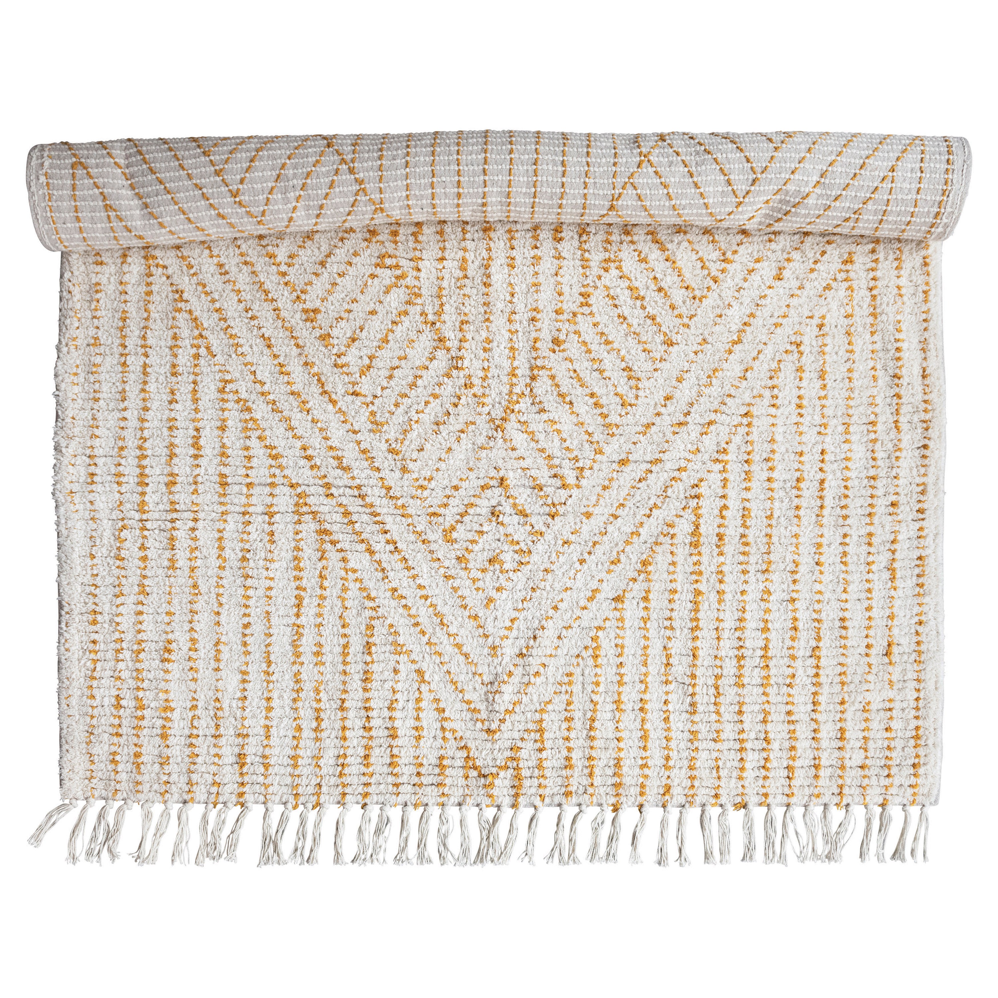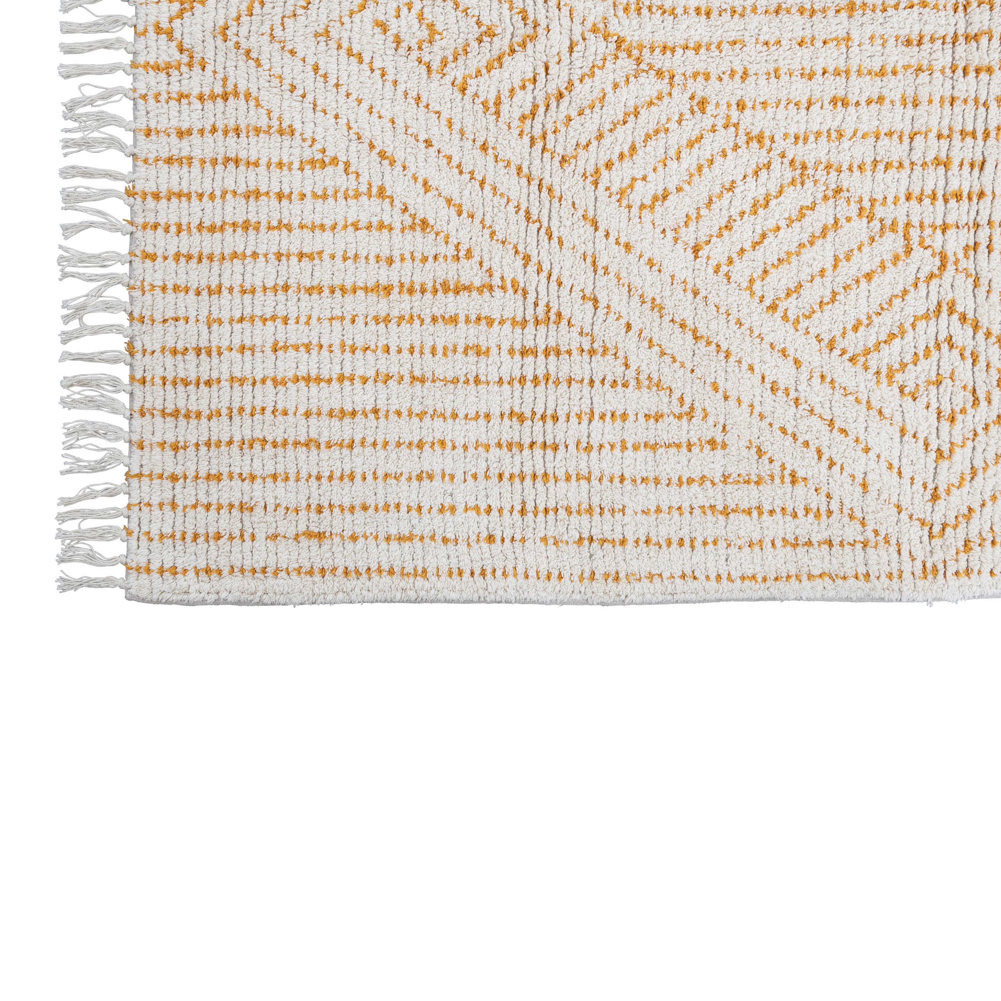 This boho inspired rug showcases a geometric striped pattern on stonewashed tufted cotton with fringe. Ivory and mustard stonewashed cotton tufted rug with geometric striped pattern and fringe. Spot Clean Only. 97% Cotton, 3% Other Fibers.