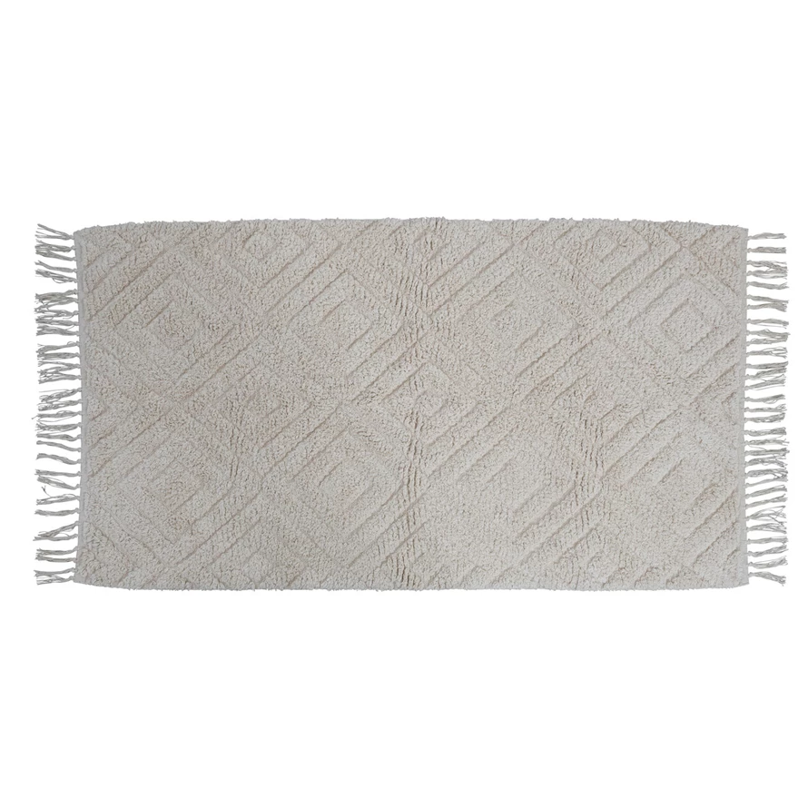 This cozy throw rug features a tufted diamond pattern on supple cotton with decorative fringe. Cream cotton tufted rug with diamond pattern and fringe. Spot Clean Only. 97% Cotton, 3% Other Fibers.