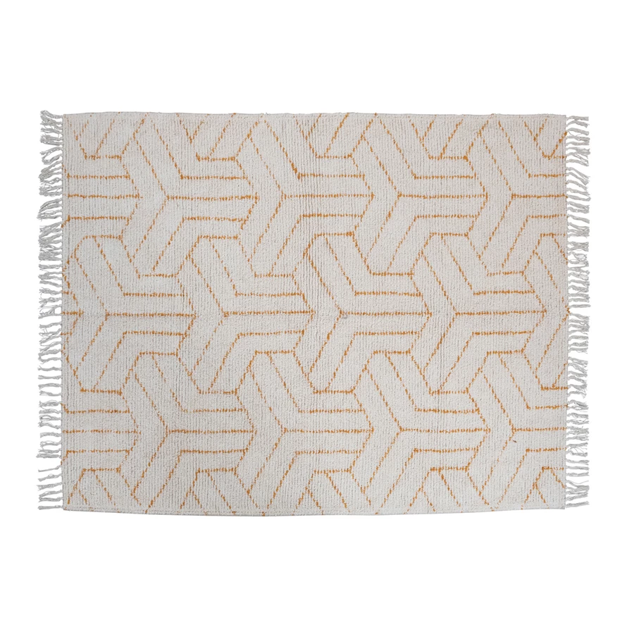 This boho-inspired rug features soft, tufted cotton construction with a stonewashed geometric pattern, finished with decorative fringe. Ivory and mustard tufted cotton rug with stonewashed geometric pattern and fringe. Spot clean only. Made from 100% cotton blend.