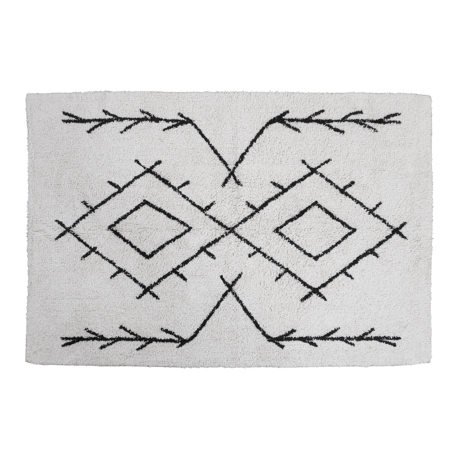 This modern boho rug showcases a geometric print on soft tufted cotton. Black and white tufted cotton geometric print rug. Spot Clean Only. 97% Cotton, 3% Other Fibers.