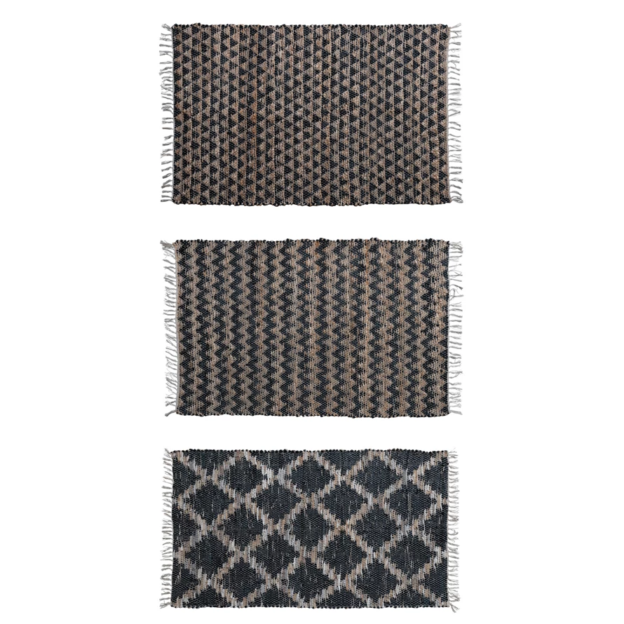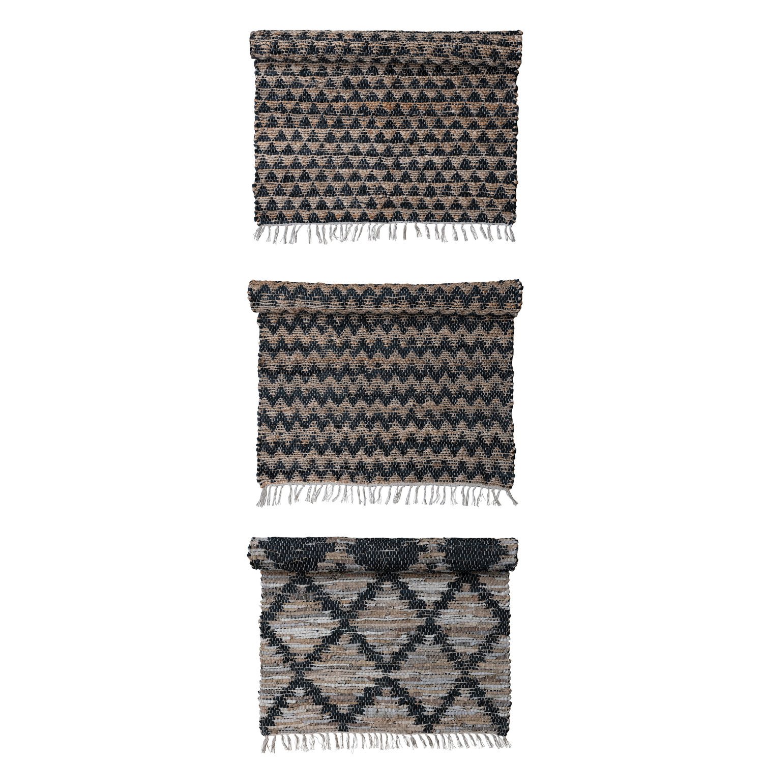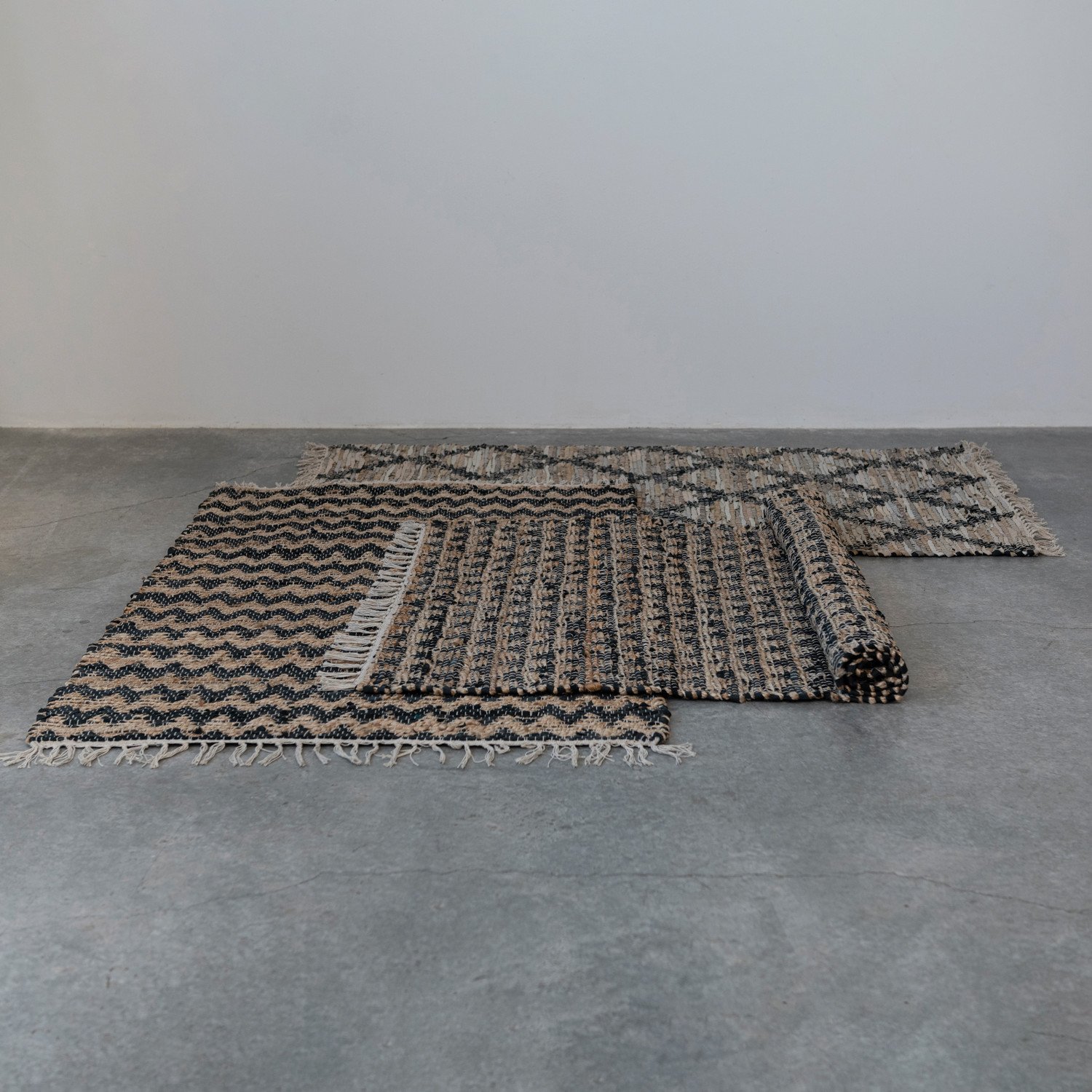 Catalog Name: 3' x 5' Woven Cotton Chindi & Leather Rug w/ Pattern & Fringe, Black & Natural, 3 Styles