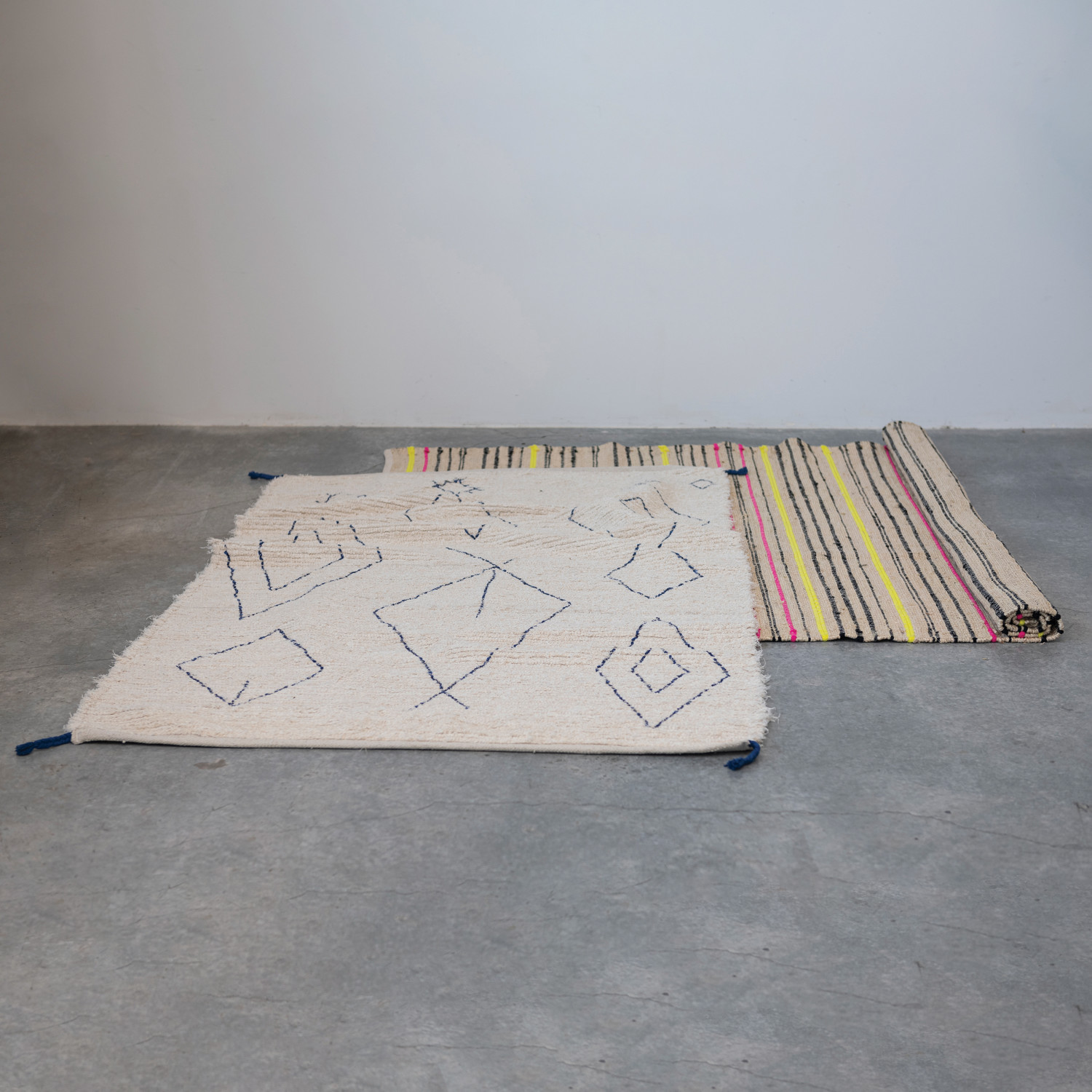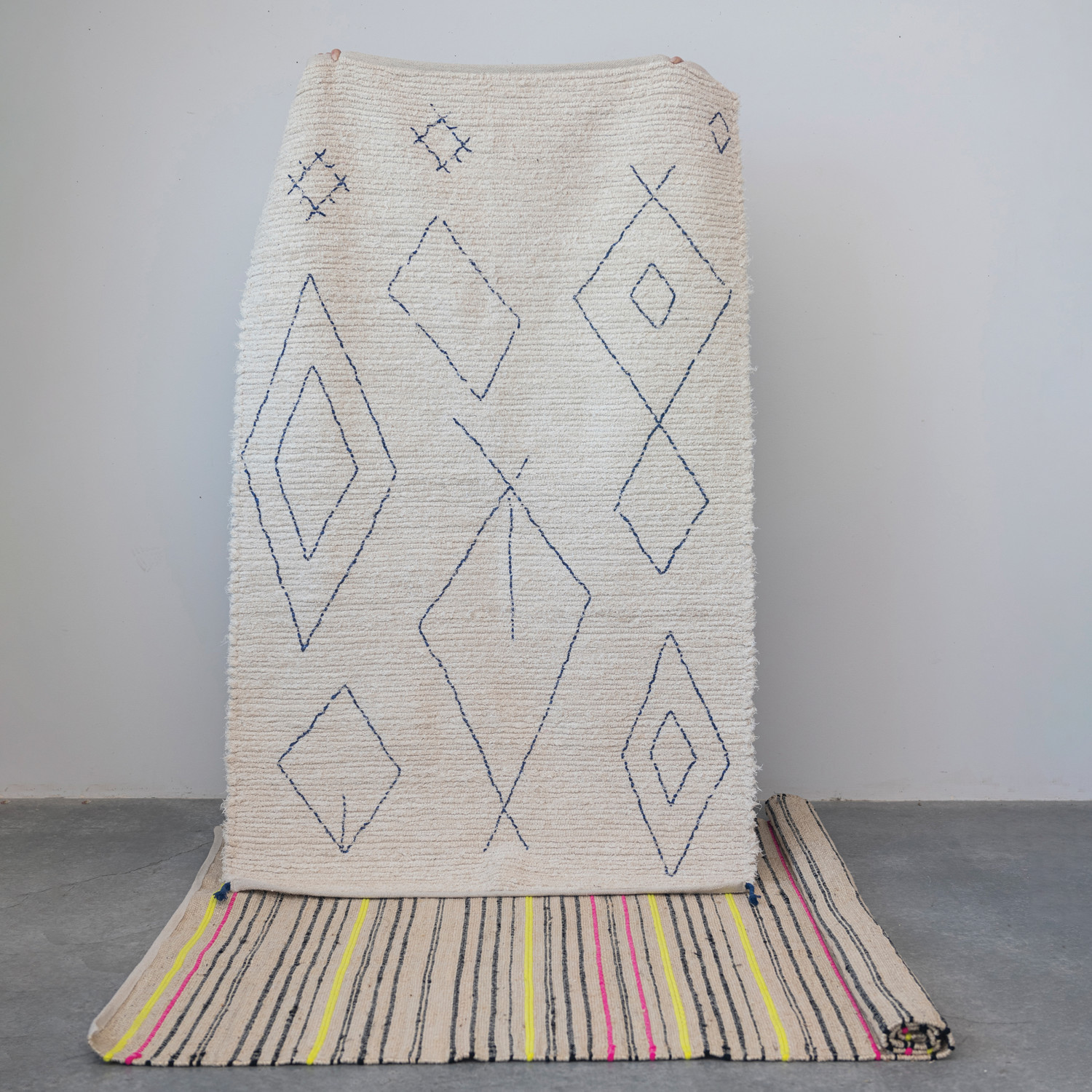 Cotton Tufted Rug w/ Moroccan Design & Braided Tassels, Natural & Blue