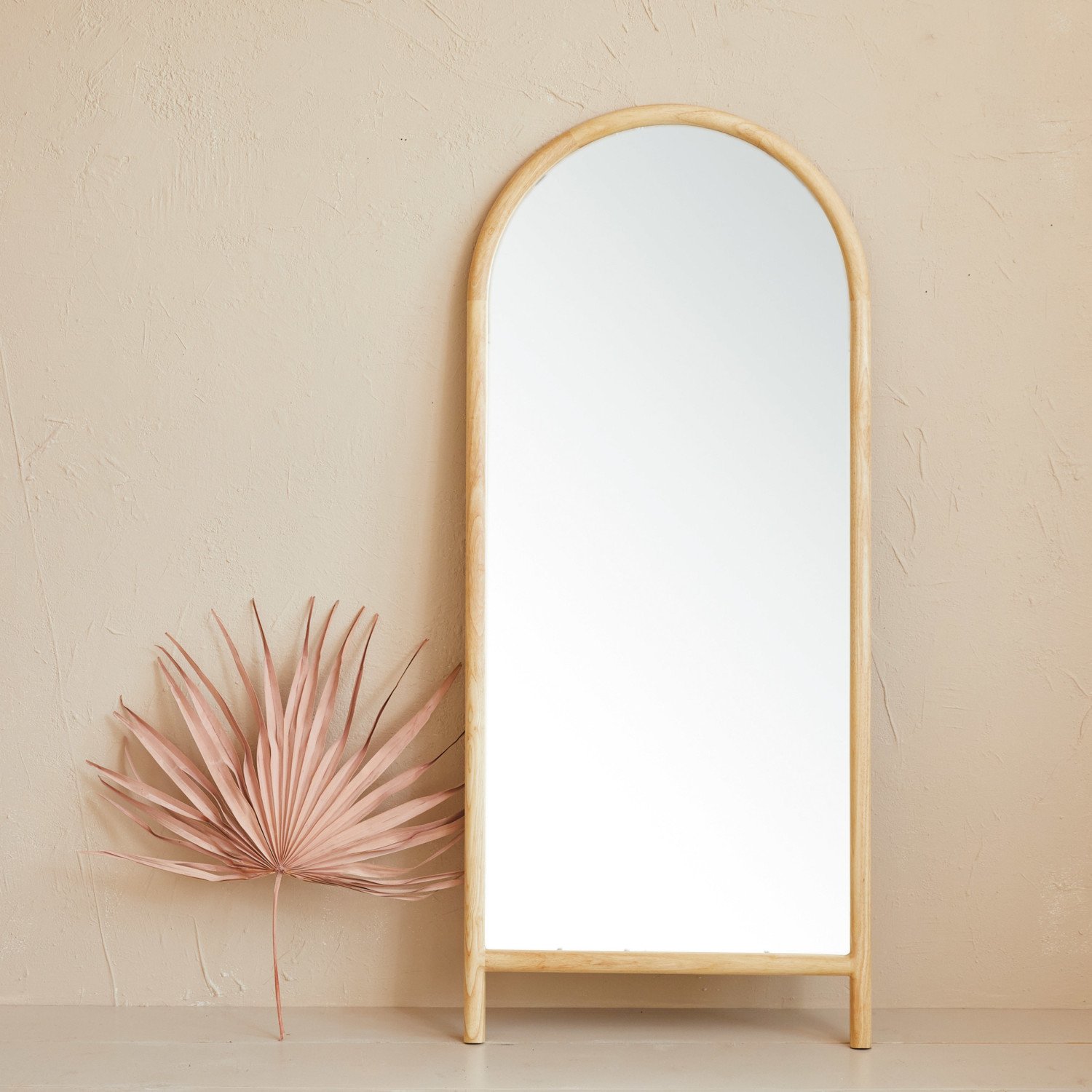 Catalog Name: 30-1/4"W x 70"H Mango Wood Framed Arched Footed Floor Mirror, Natural, Truck Ship (Hangs or Stands)