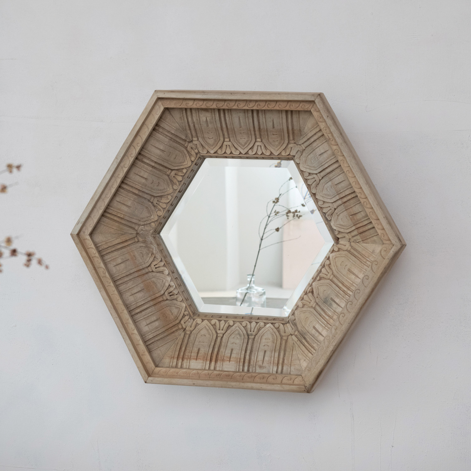 Catalog Name: 29"W x 7"D x 31"H Hand-Carved Deep Framed Mango Wood Vintage Reproduction Hexagon Shaped Beveled Wall Mirror, Sun-Bleached Finish, Truck Ship