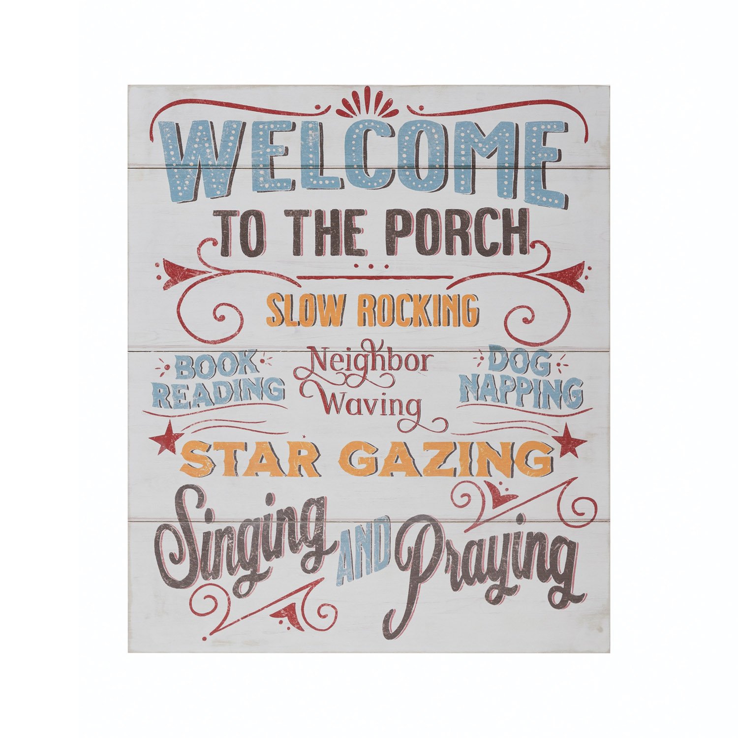 This farmhouse-inspired wall hanging features a wood paneled construction with sentimental messages. Multicolor wood panel wall hanging with "welcome to the porch" quotes. Display this stunning wall decor to effortlessly enhance the design of any living space. Made from 100% plywood.