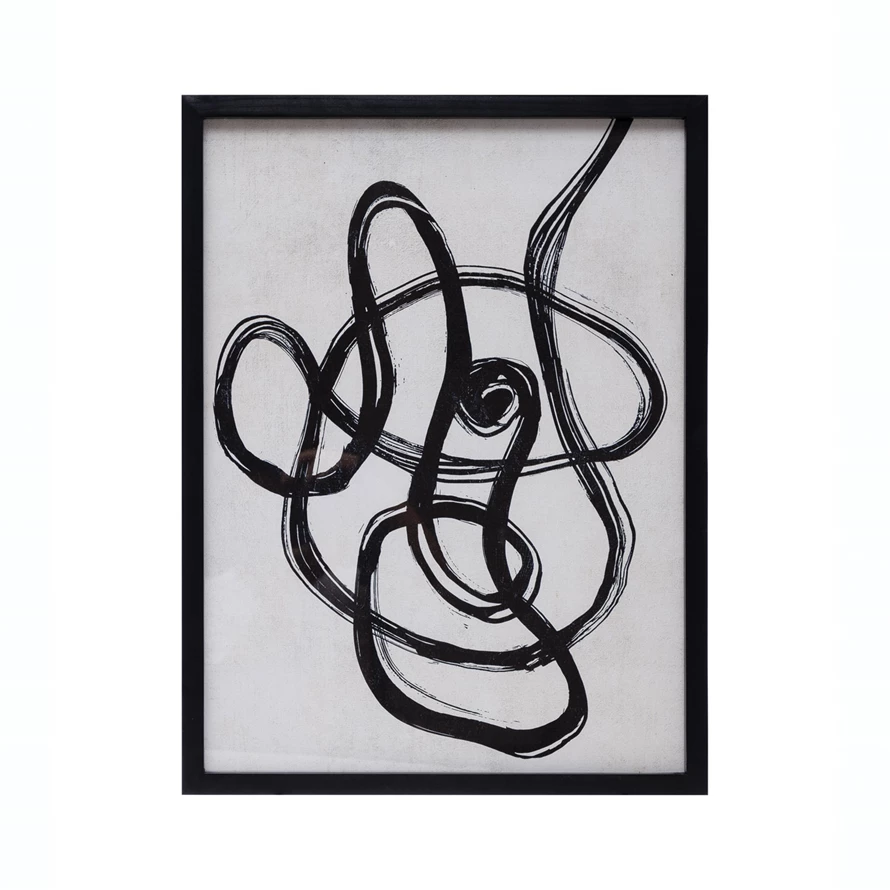 This strikingly modern wall décor showcases an abstract design in a sleek wood frame. Black and white abstract design in wood frame with glass cover. Display this stunning wall decor to effortlessly enhance the design of any living space. Made from fir wood, sustainable MDF, glass, and paper.