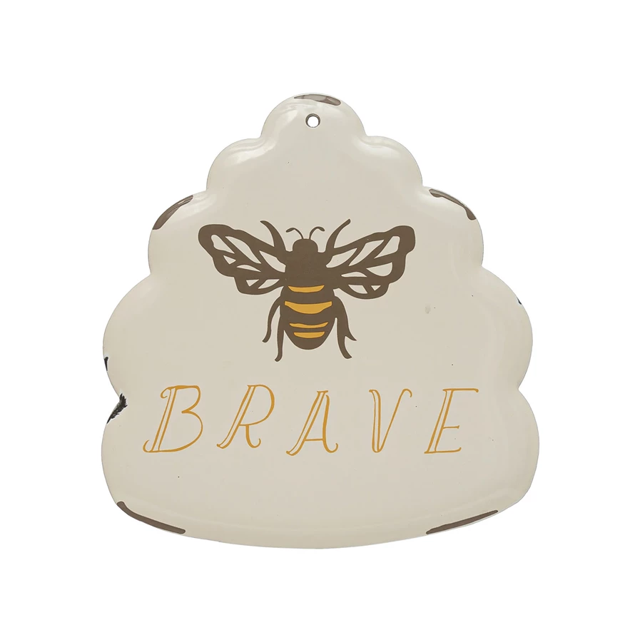 This darling pieces of wall art showcases a metal beehive silhouette finished with a whimsical bee illustration and inspirational message. Distressed white enameled metal wall hanging beehive with black and yellow bee illustration and "brave" quote. Display this stunning wall decor to effortlessly enhance the design of any living space. Made from 100% glazed iron.
