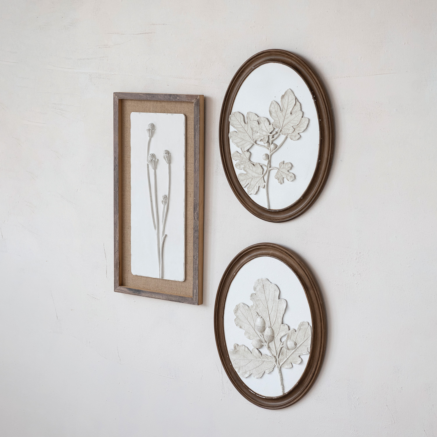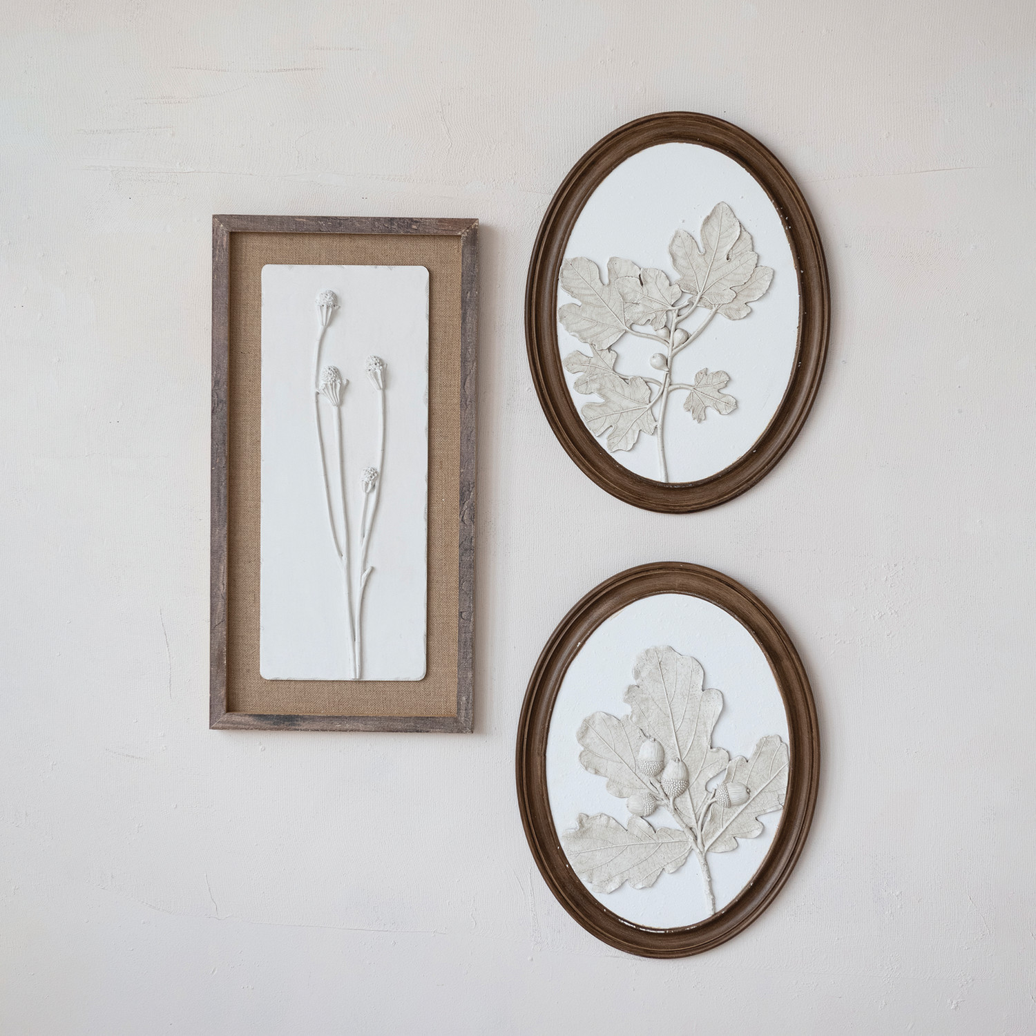 Catalog Name: 12-1/2"W x 24-1/4"H Wood Framed Wall Décor w/ Plaster Cast Botanical & Jute Mat, White & Brown