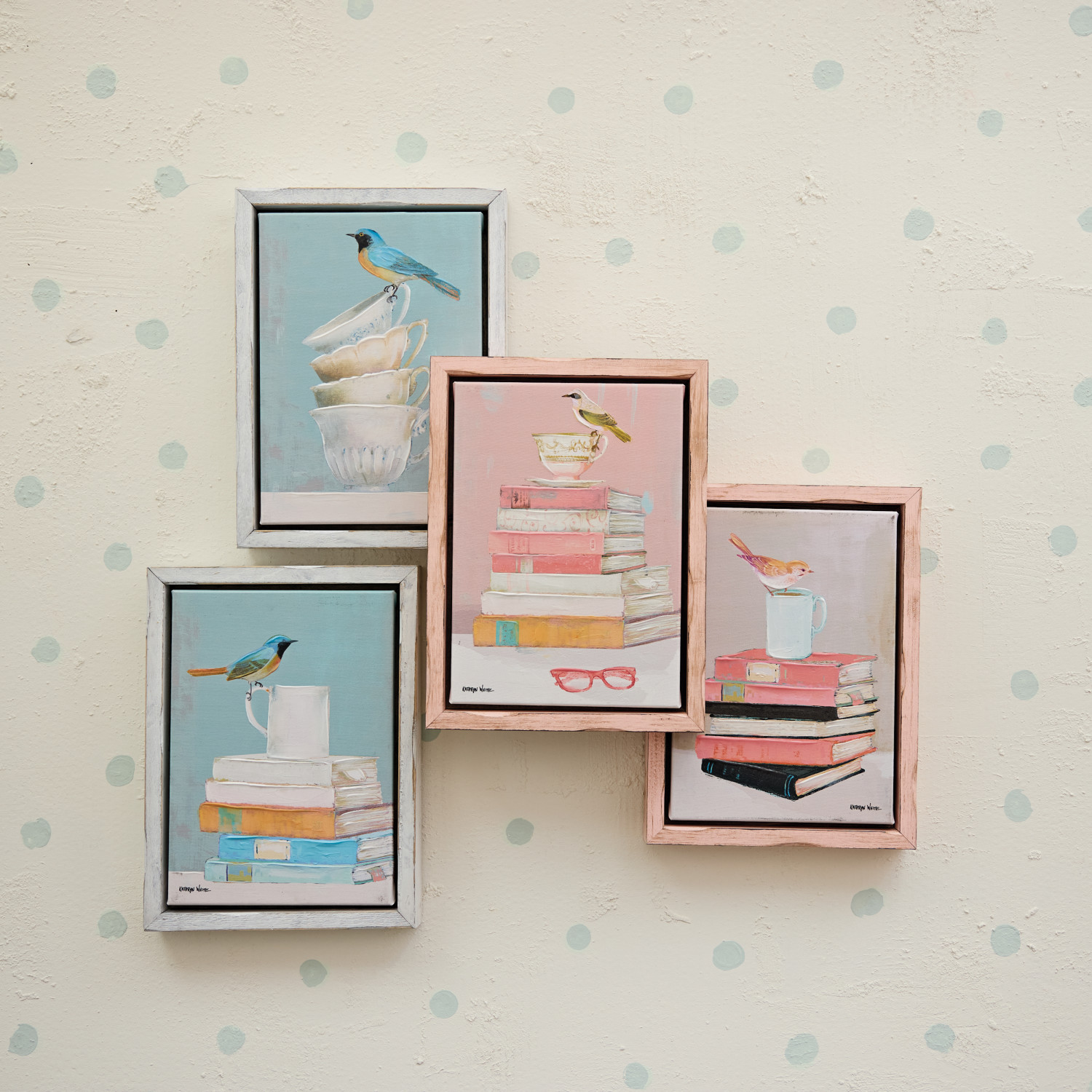Wood Framed Hand-Painted Canvas Wall Decor with Bird & Mugs/Books, 4 Styles