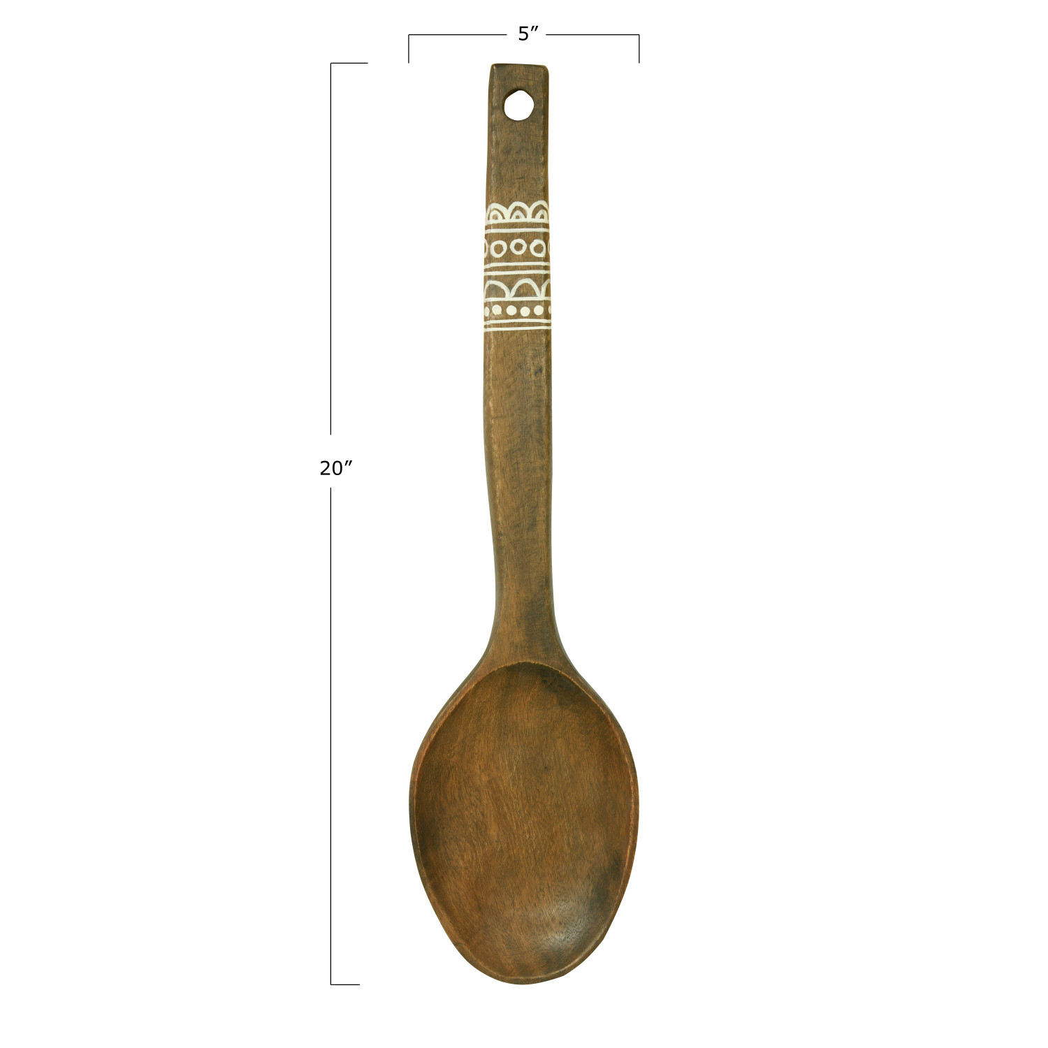 Add a vintage touch to the kitchen decor with this oversized wall spoon. Made from mango wood, it has been hand-painted with a beautiful white patterned accent. Pair with other oversized wood utensils for a complete and cohesive setting.