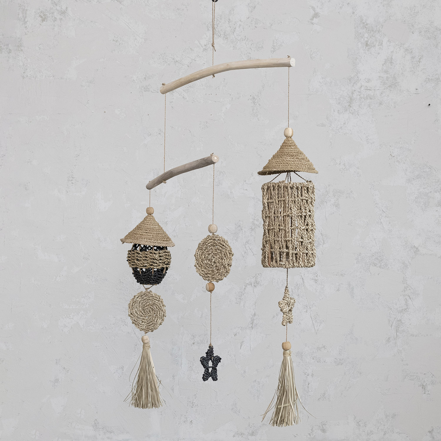Wood & Hand-Woven Seagrass Mobile/Wall Hanging, Black & Natural