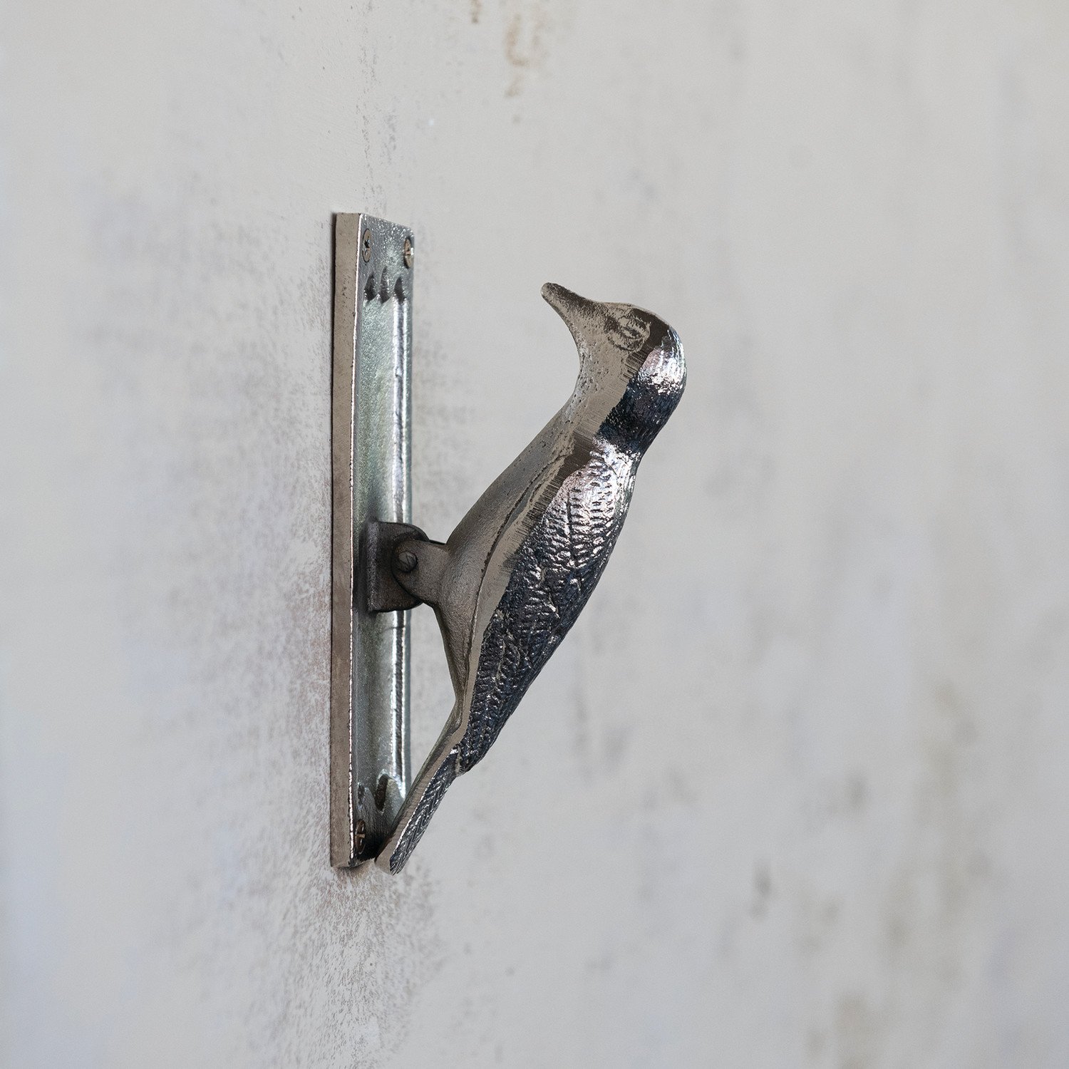 Catalog Name: 2"W x 2"D x 6"H Cast Iron Bird Shaped Door Knocker, Nickel Finish
