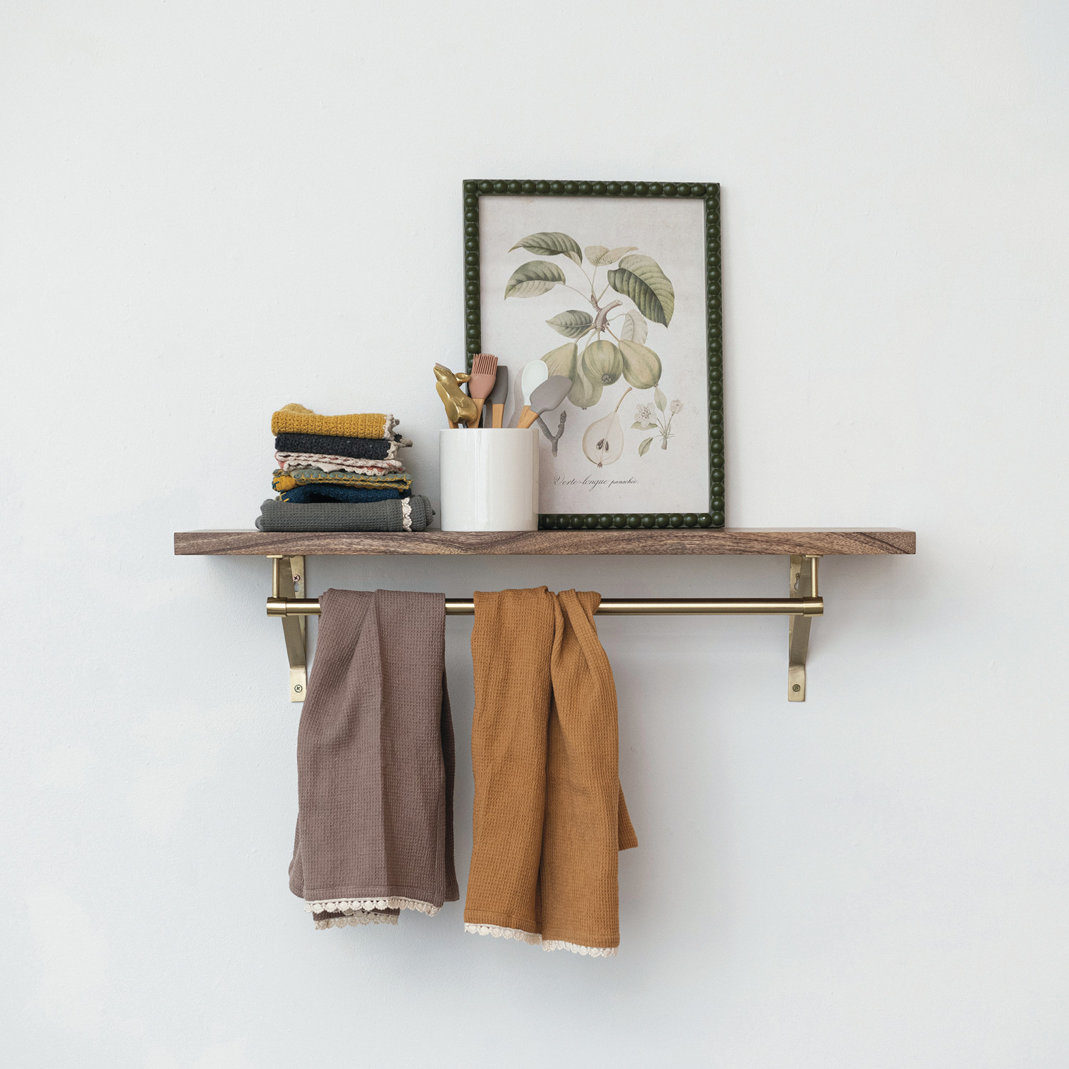 Catalog Name: 32"W x 8"D x 8"H Mango Wood & Metal Wall Shelf w/ Rod, Antique Gold Finish & Natural, KD