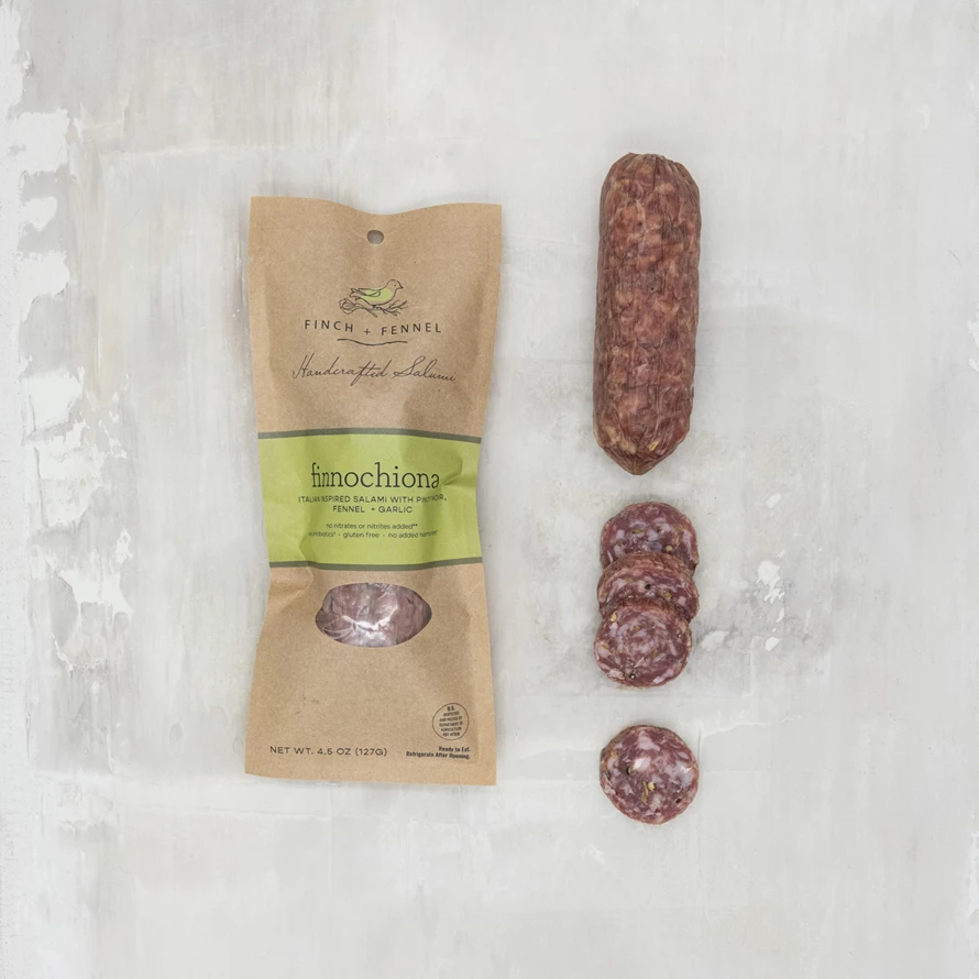A fennel-flavored salumi with its roots in Tuscany, Italy. Made with humanely raised heritage pork, red wine, fennel, and garlic. No added nitrates. Pair with an aged provolone, semi-dry cider, or wine.