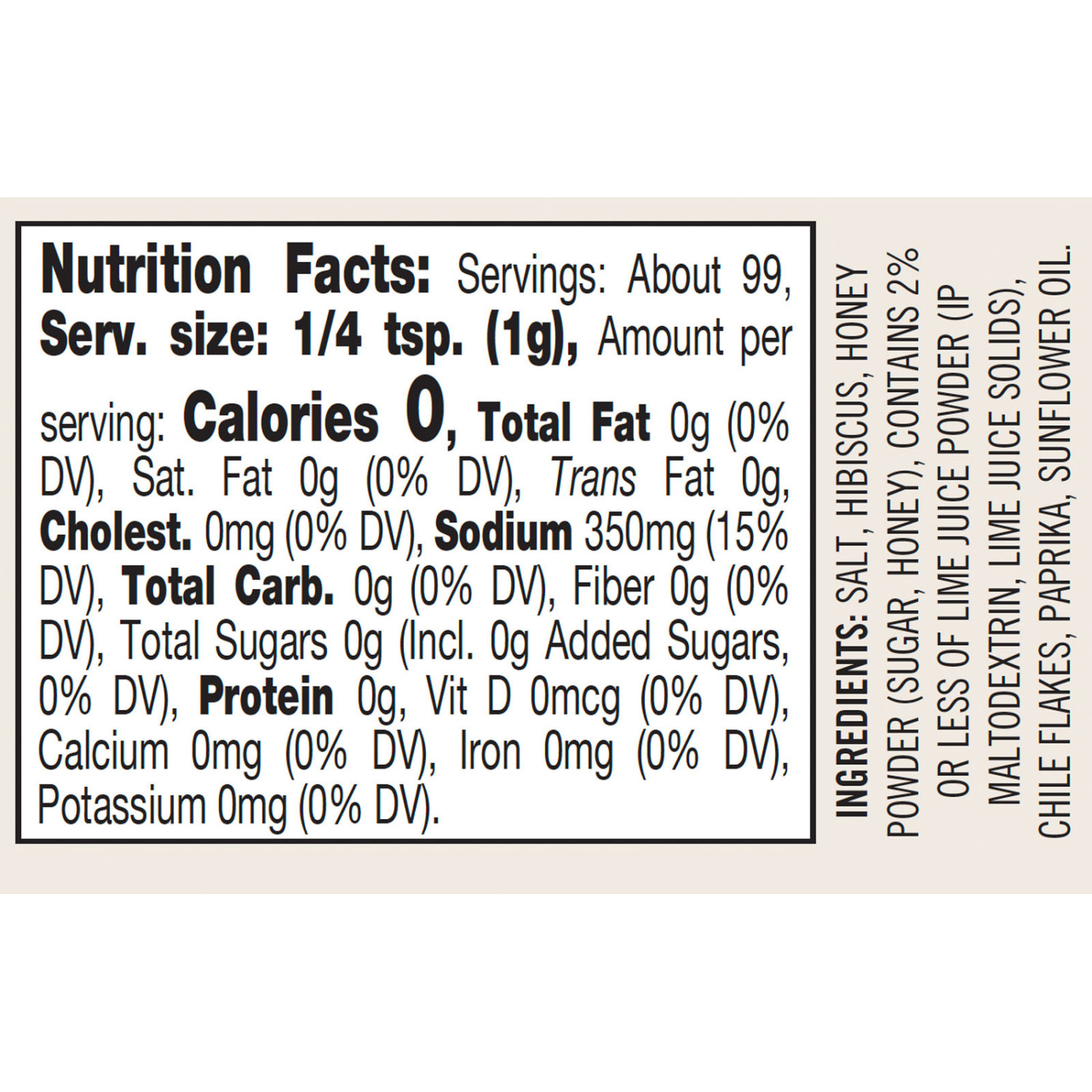 Hibiscus Chile-Lime Sea Salt is an elegant, flavorful combination of spicy Chile peppers, tart hibiscus powder, and refreshing lime. This blend perfectly complements a wide array of foods and drinks. Item is certified Kosher.