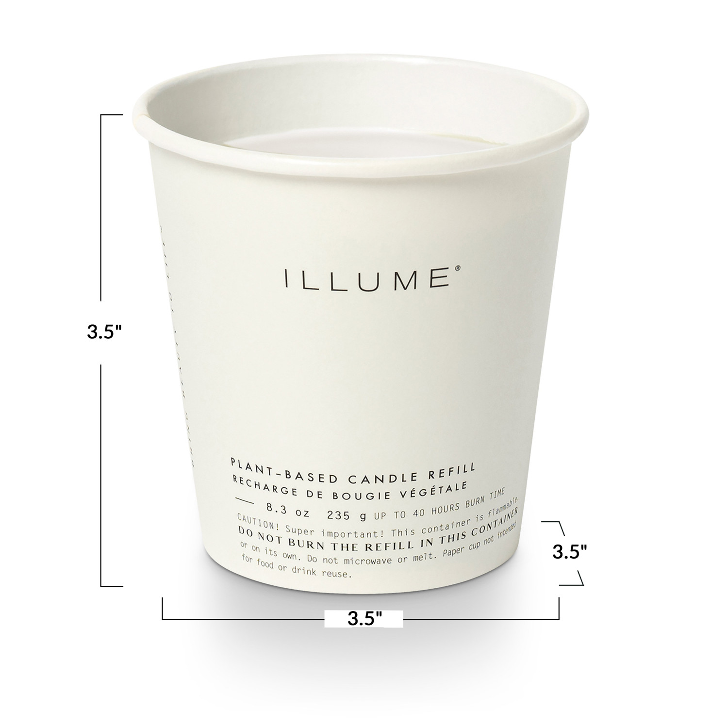 Our boxed glass candle refill has a clean burning, plant-based wax blend and is sustainably packaged in a compostable paper cup. This scent is grounded in earthy amber glow, with a heart of a summery sea, and kissed with lily dew. Plant-based soy blend candle poured in the USA. Reduce, reuse, and try out a new fragrance or two with our easy-to-use refills. Burns up to 40 hours in approved vessel.