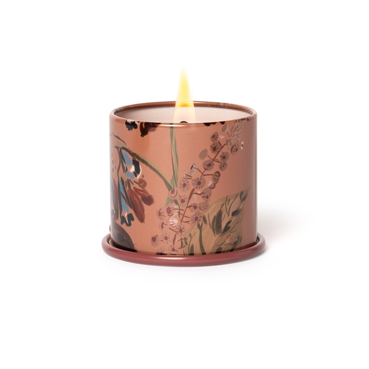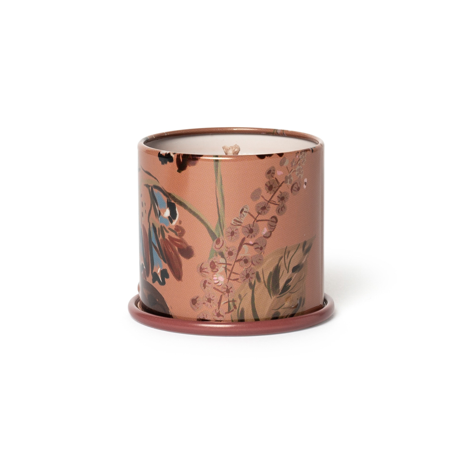 This scent is grounded in sheer cashmere musk with a heart of bright tobacco leaf and kissed with sunny sweet orange. Designed as a pop of pattern, our large vanity tins have a full wrap label on textured stock, interior pattern with metallic details, and a color rolled edge to complement the colored wax. We use tin for its lovely illuminating qualities and because it is infinitely recyclable. 100% vegan and cruelty-free. Burn time up to 20 hours.