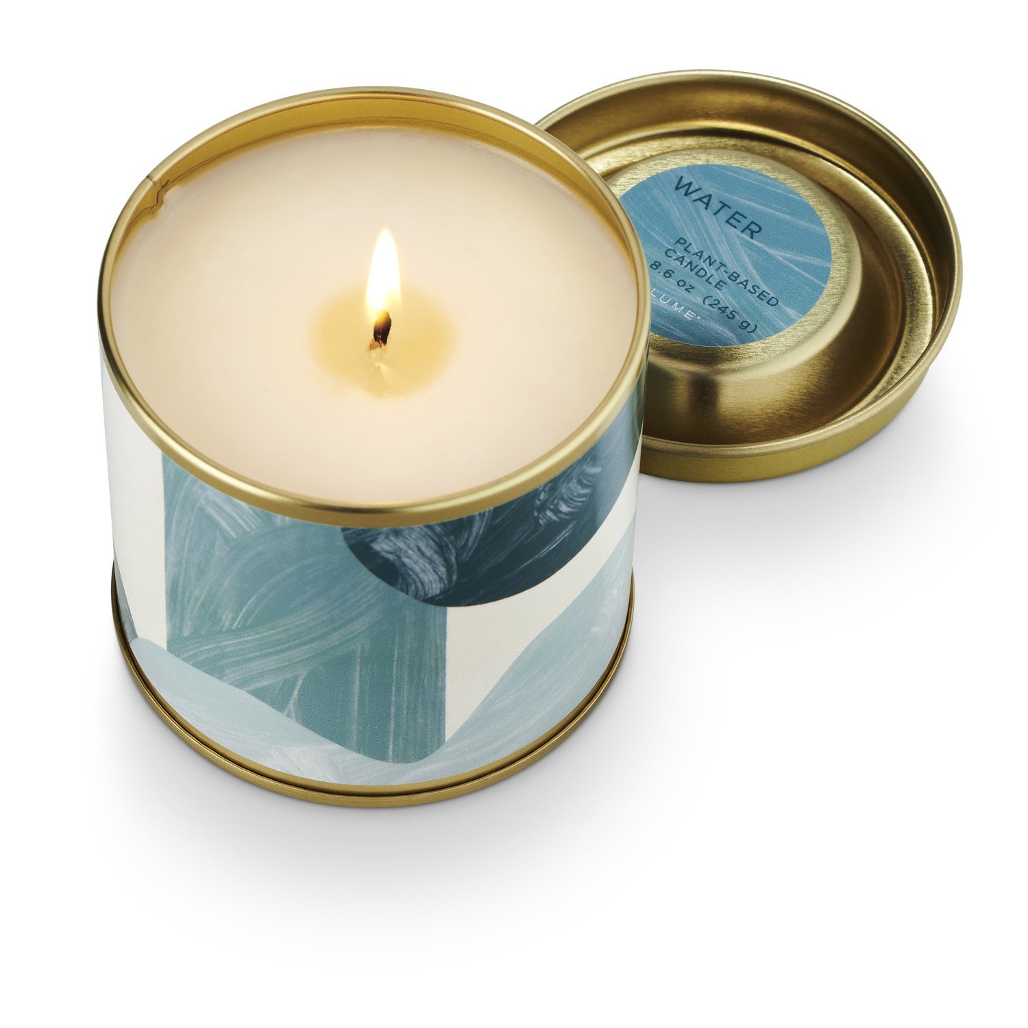 A painterly tin candle with organic shapes and movement, lidded in matte gold.