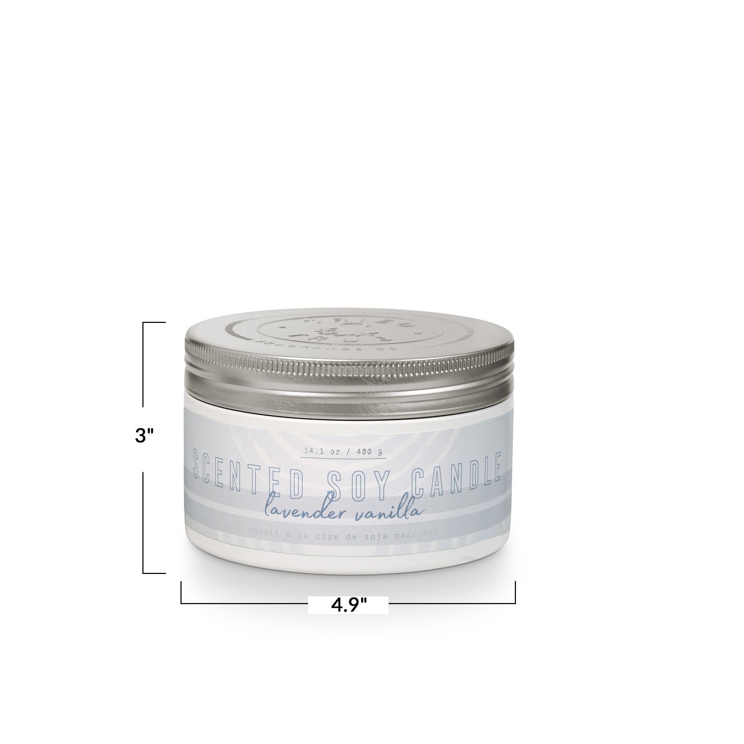 Fresh and familiar for every room in the house. Perfect for any room, the Large Tin with colored wax and a decorative wrap label makes a perfect addition to seasonal home decor. Design details like hand illustration and an embossed lid add quality and style. This scent features notes of lavender, eucalyptus, and vanilla. Plant-based soy blend candle poured in the USA. Thoughtfully designed from wax to wick, our candles add warmth and ambiance to any interior design scheme. Burns up to 30 hours; 2 wicks.