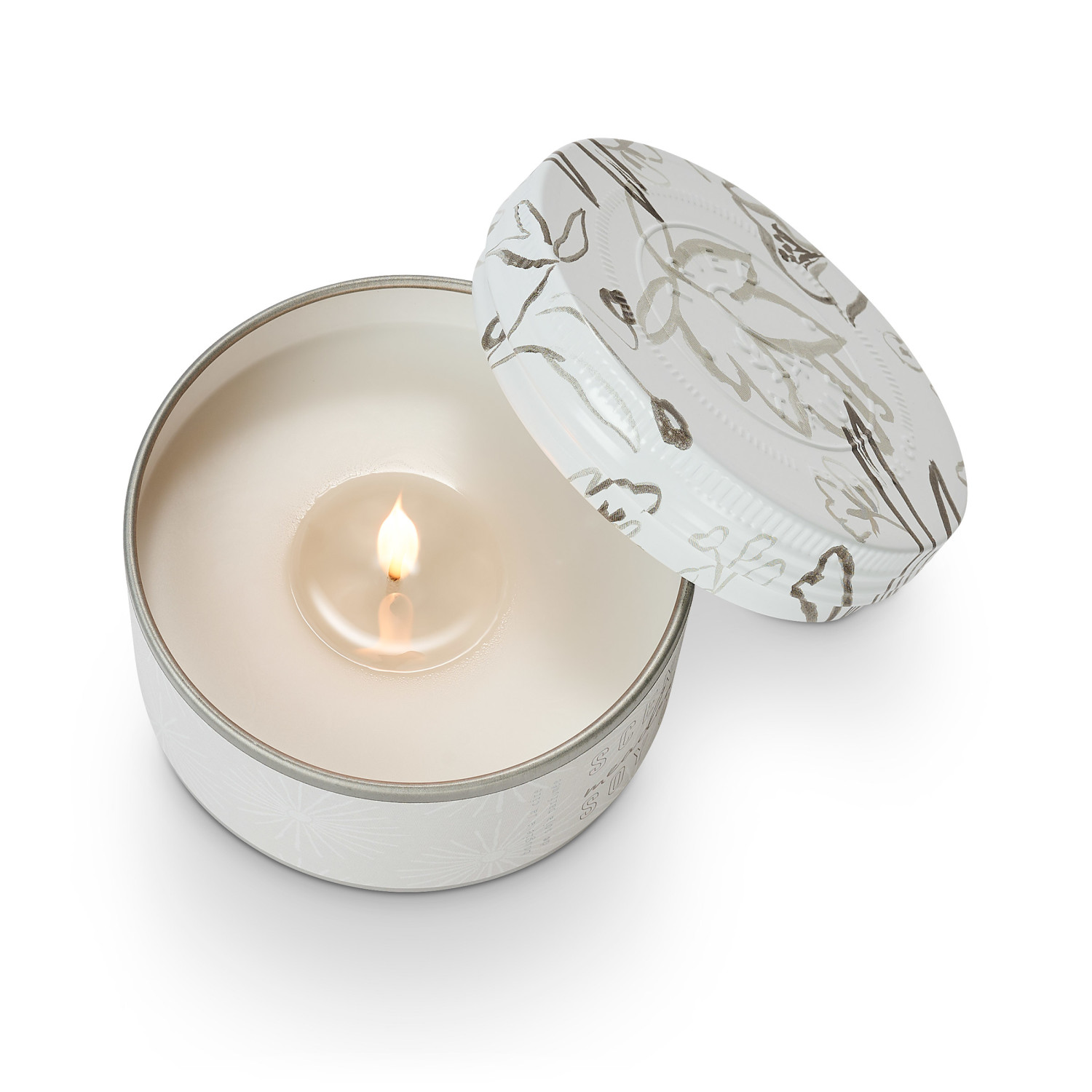 Fresh and familiar for every room in the house. Great for gifting, the small tin with colored wax and a decorative wrap label makes a perfect addition to seasonal home decor. Design details like hand illustration and embossed lids add quality and style. This scent features notes of star jasmine, water lily, and amber. Plant-based soy blend candle poured in the USA. Thoughtfully designed from wax to wick, our candles add warmth and ambiance to any interior design scheme. Burns up to 20 hours; 1 wick.