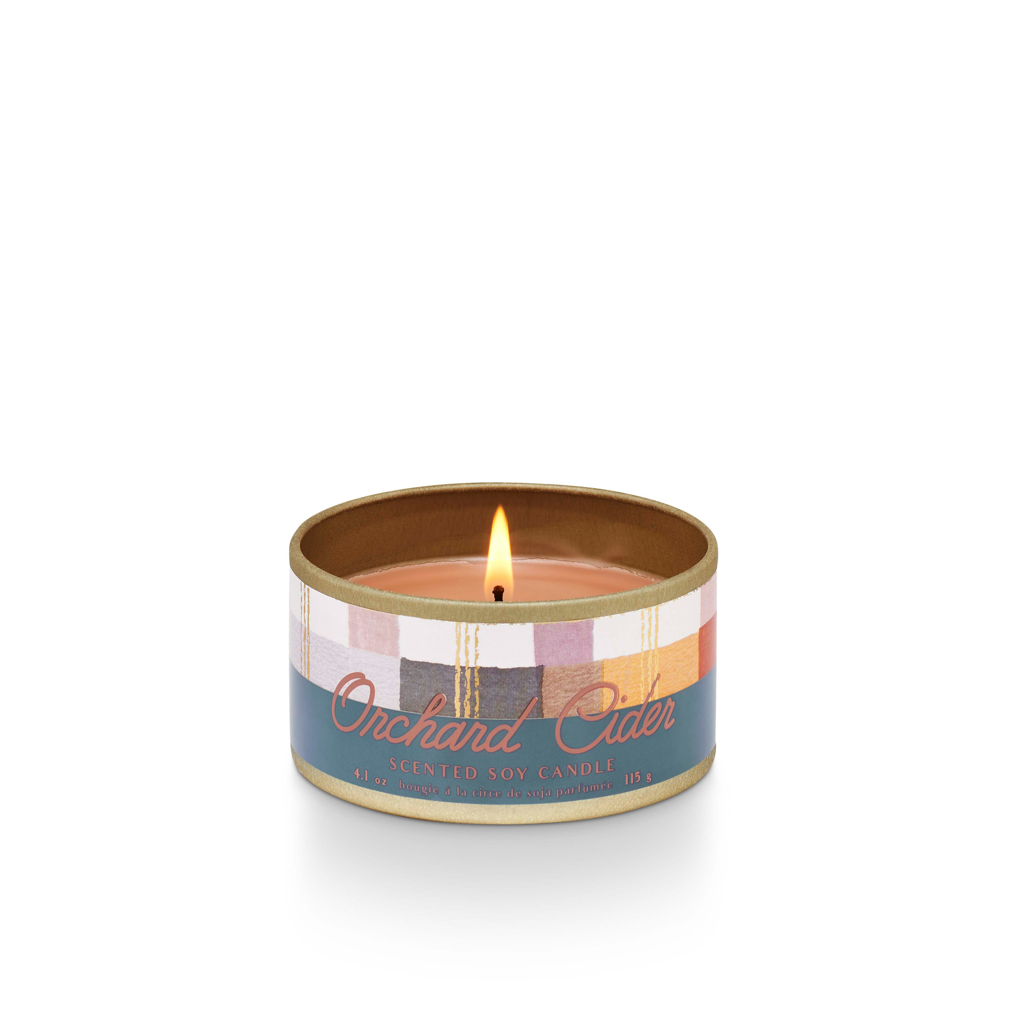 Fragrance Description: fresh cider, pomegranate, and clove. This scented 4.1 oz tin candle with lid makes a great gift. 20 hour burn time.