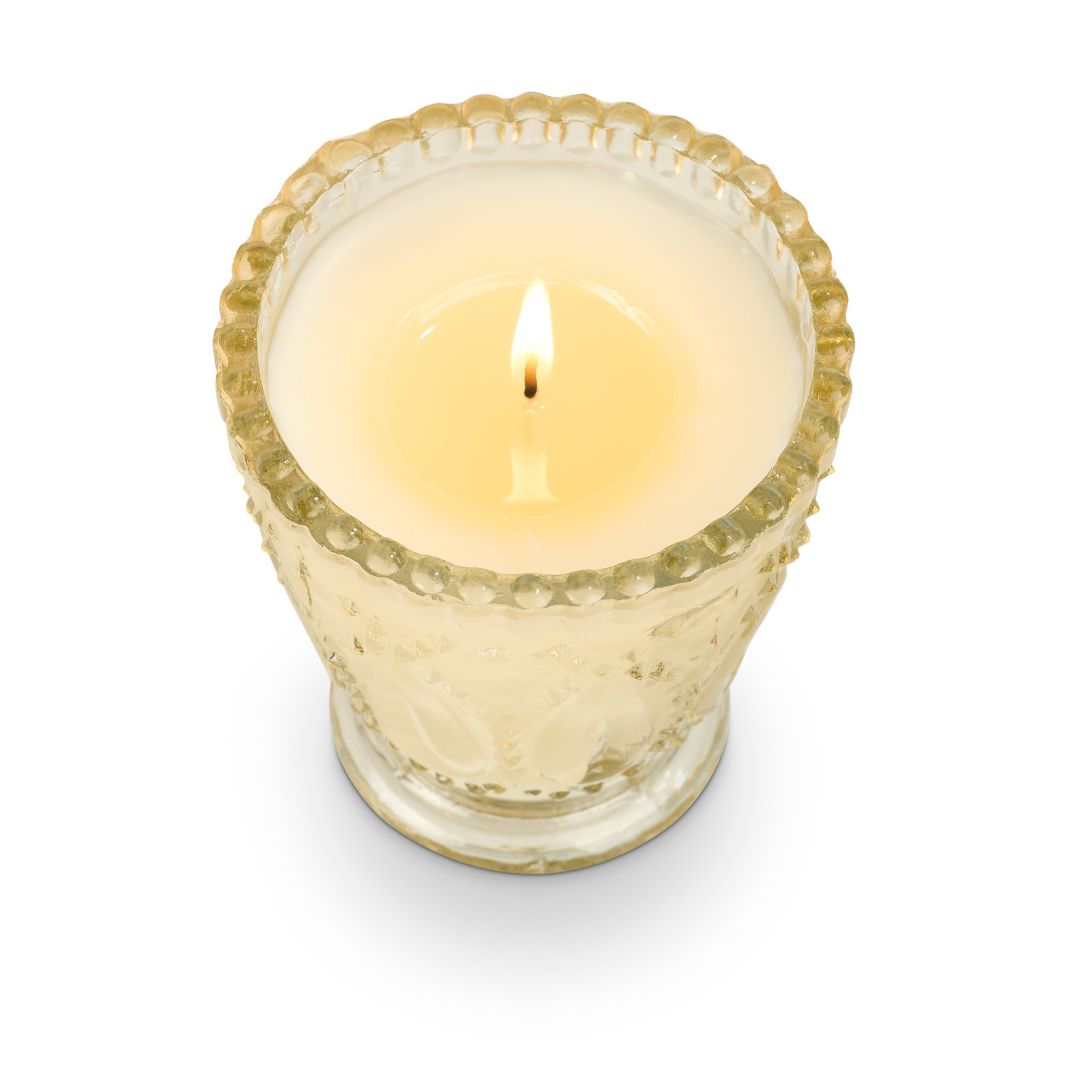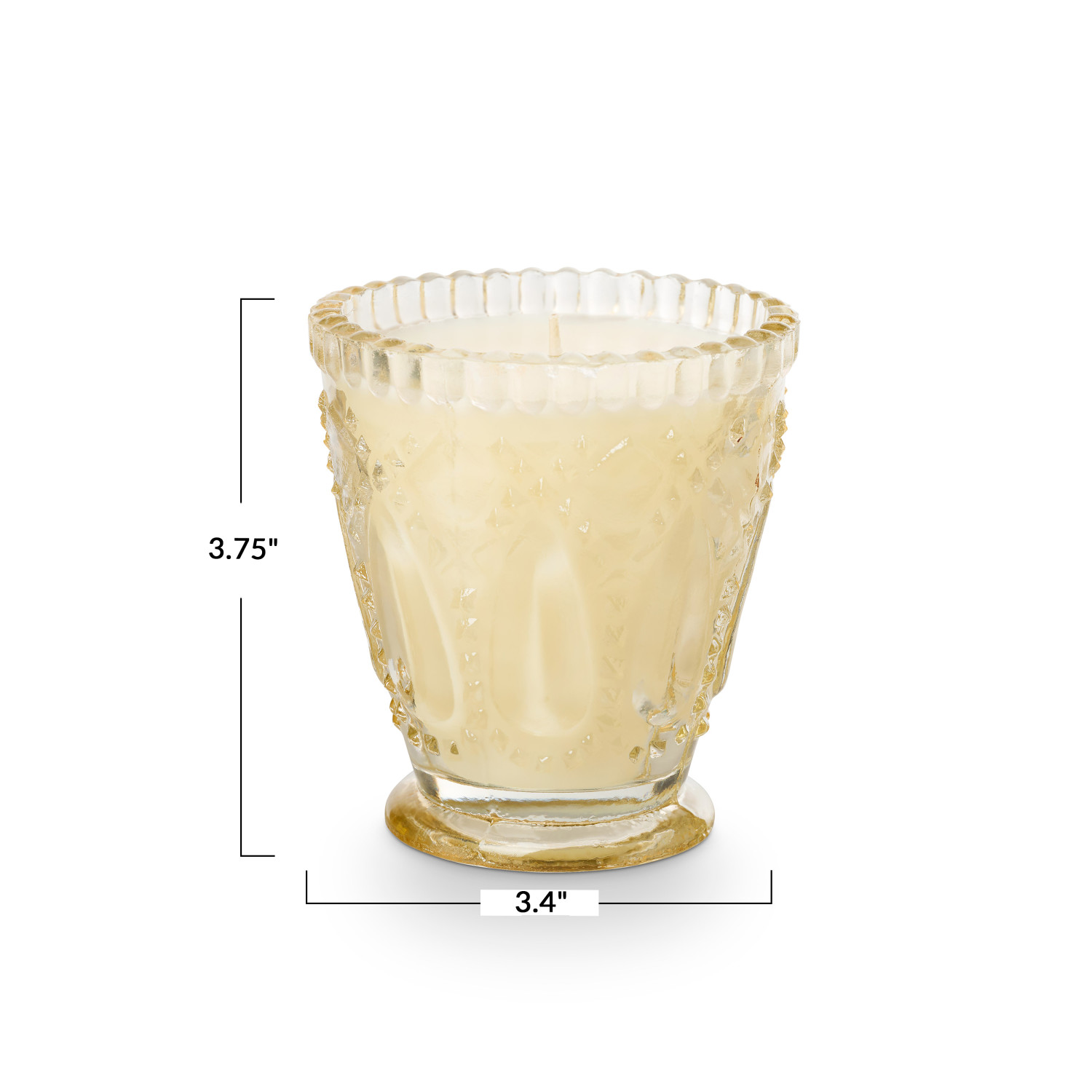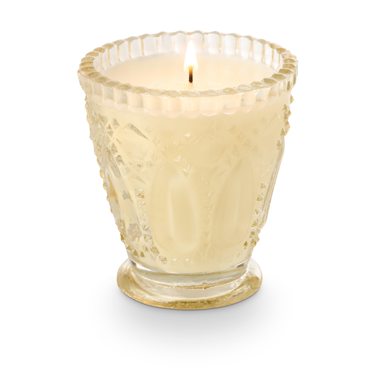 Fresh and familiar for every room in the house. With an heirloom quality to it, the pressed glass has vintage appeal with delicate patterns and a footed base. This scent features notes of star jasmine, water lily, and amber. Plant-based soy blend candle poured in the USA. Thoughtfully designed from wax to wick, our candles add warmth and ambiance to any interior design scheme. Burns up to 30 hours; 1 wick.
